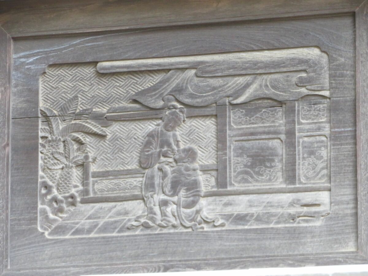 本殿の西面に刻まれる『二十四孝』の唐婦人