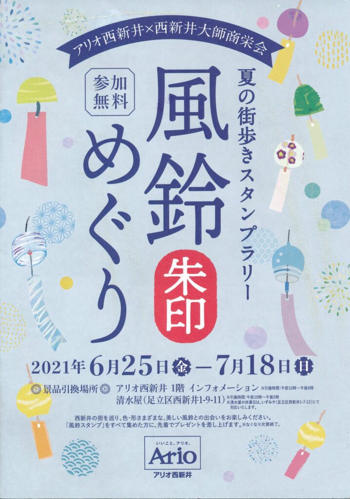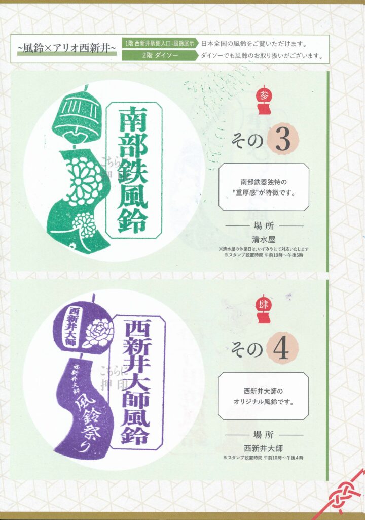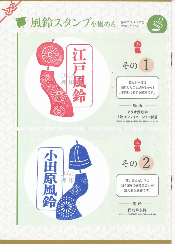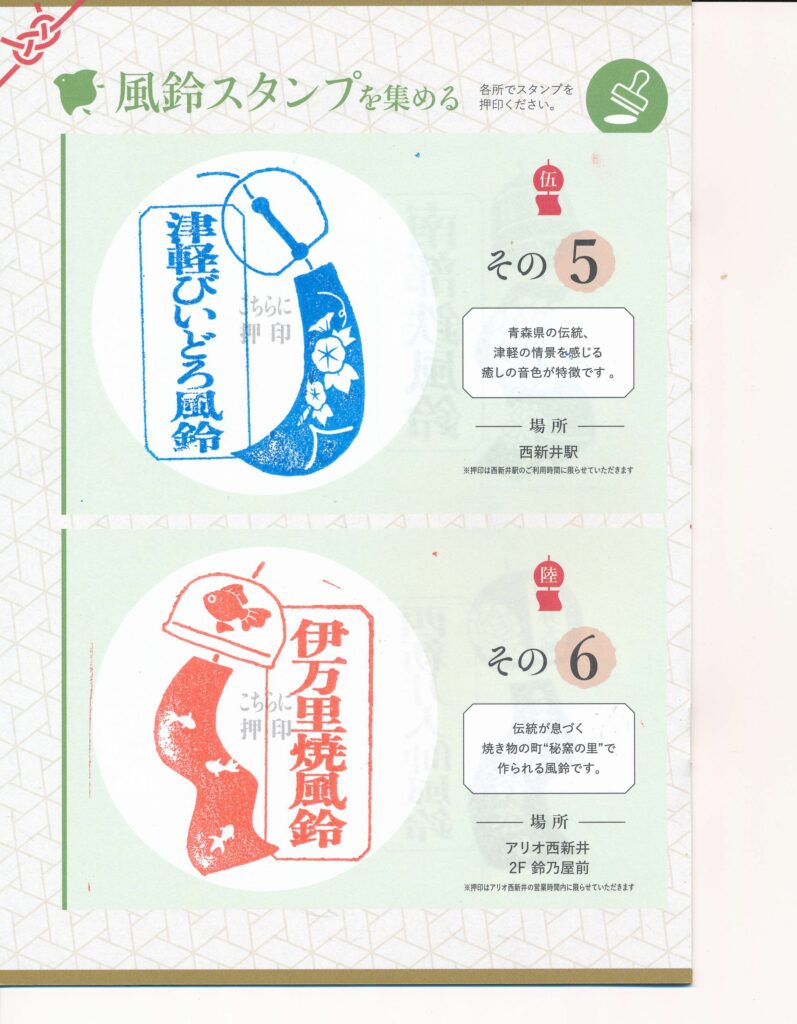 6つの設置場所に準備されるスタンプは、各地の風鈴がデザインされたもので、新しいスタンプが押されるに従ってリーフレットがバラエティー豊かなものとなります。全てのスタンプを集めると、アリオ西新井1階のインフォメーションや清水屋で、景品の折りたたみ傘のポーチを頂くことができます。