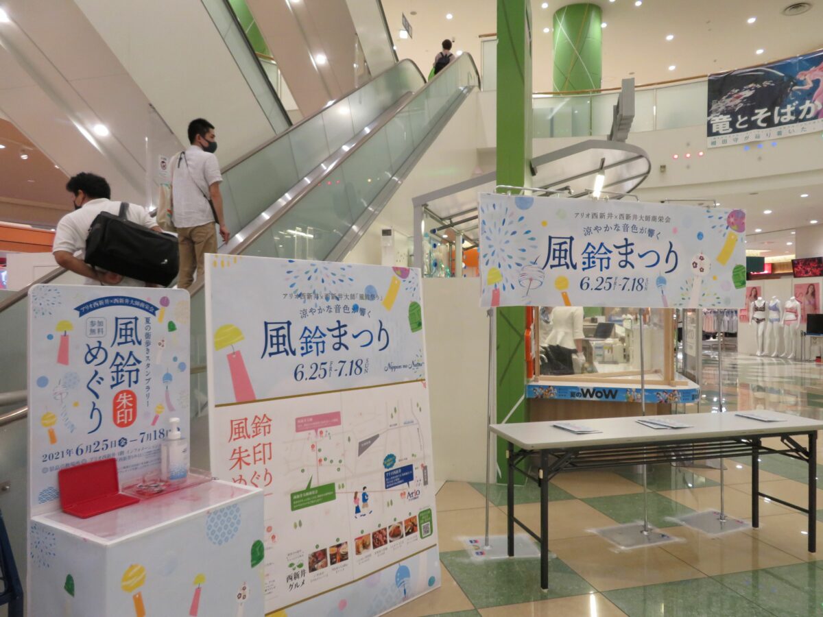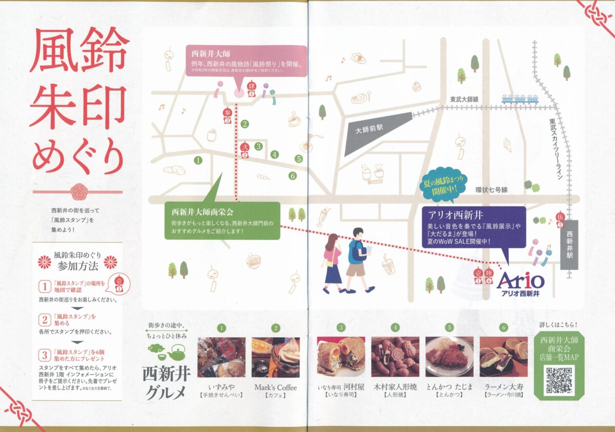 「西新井・風鈴まつり」では、「夏の街歩きスタンプラリー」が行われます。スタンプが準備されるのは東武スカイツリーラインの西新井駅、西新井駅から西に約500メートルのショッピングモール「アリオ西新井」、西新井大師周辺です。