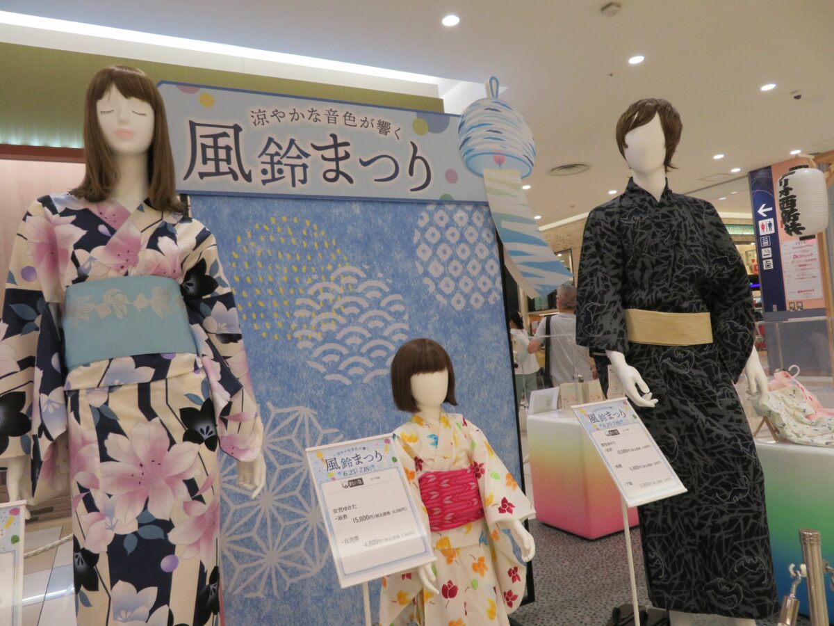 「夏の街歩きスタンプラリー」のメイン会場のアリオ西新井には風鈴が描かれたカーテンで覆われ、正面入り口には風鈴のトンネルが設置されます。トンネルに吊るされる風鈴は個性的で、豊かなデザインを楽しむことができます。トンネルの横に立つ浴衣を纏う人形には涼しさを感じることができることでしょう。