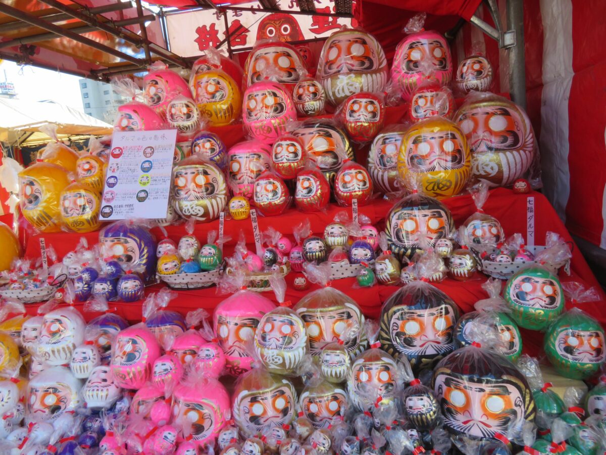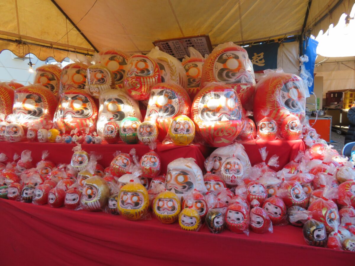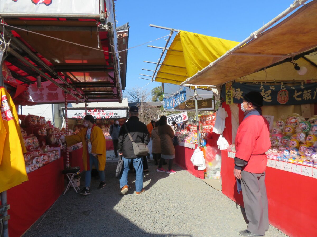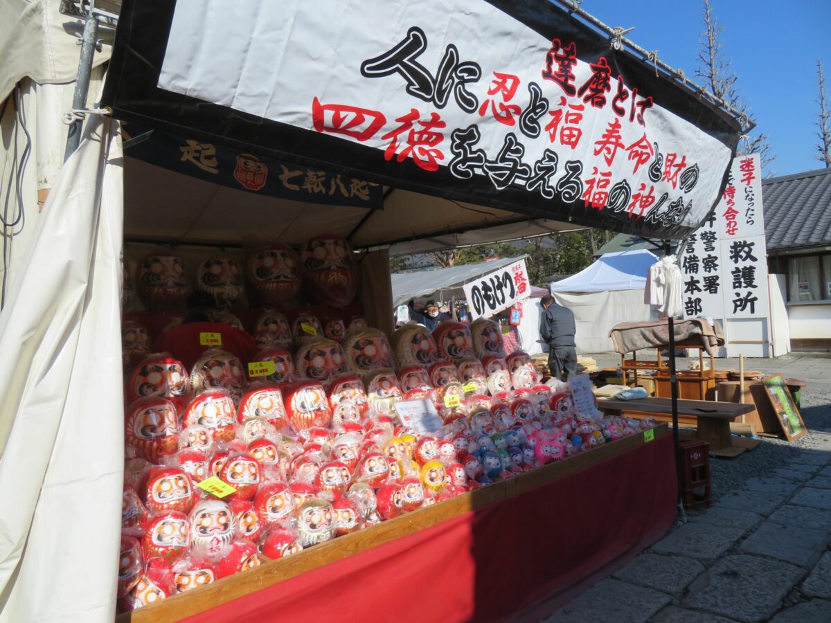 大本堂の南東のエリアには、だるま、破魔矢、熊手などの正月の縁起物の露店が並びます。