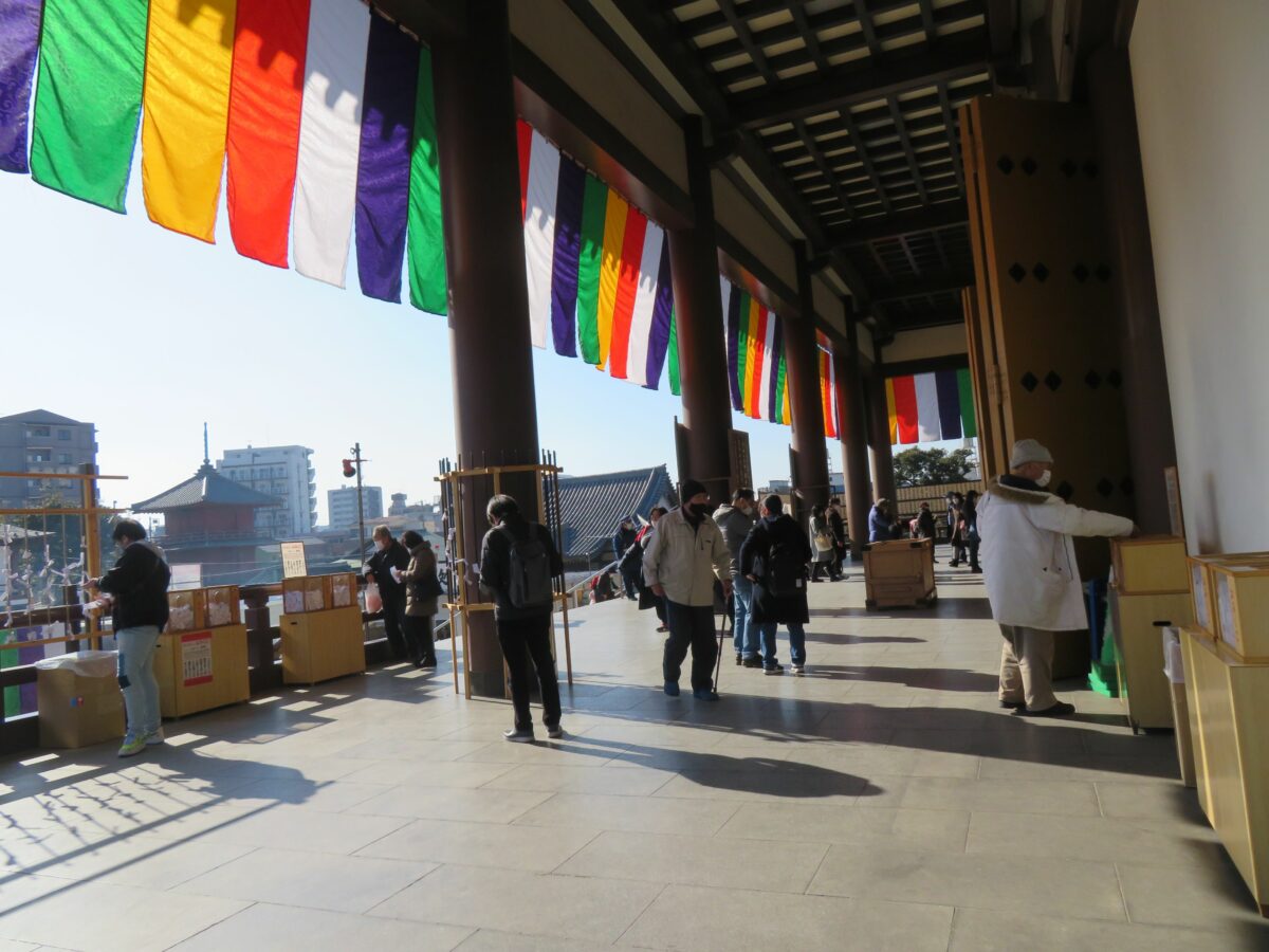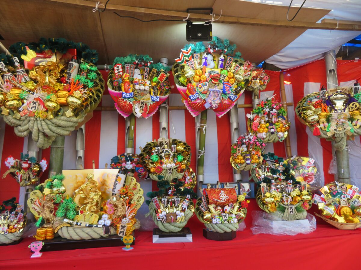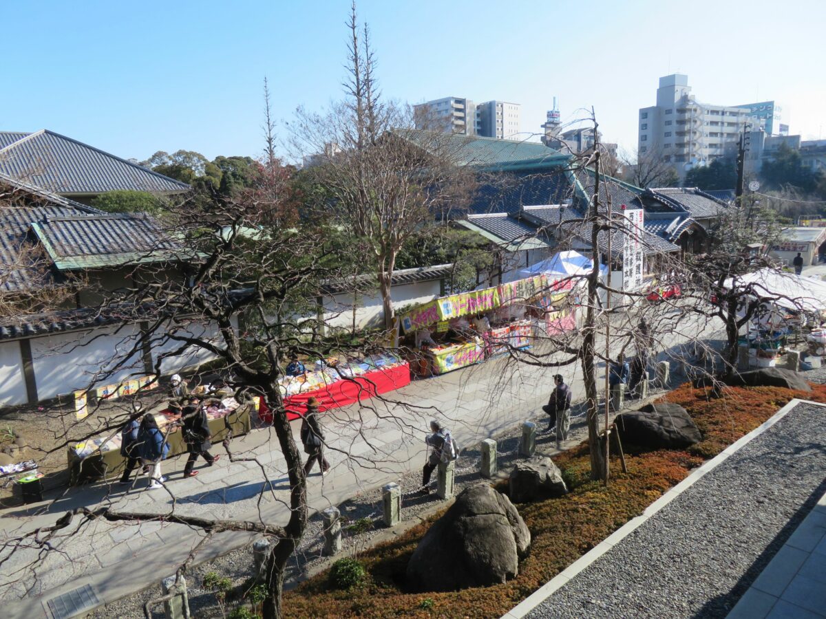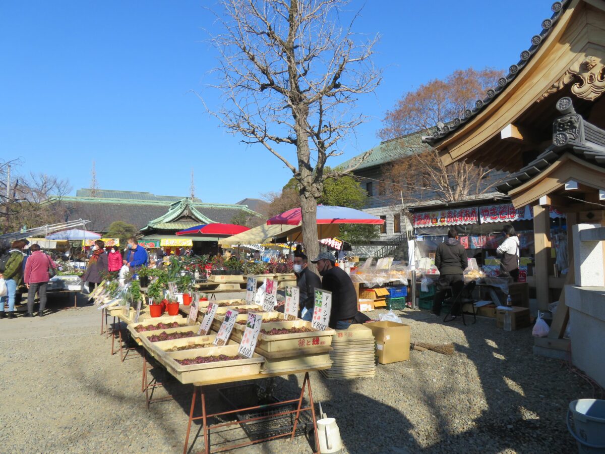 大本堂の南東のエリアには、だるま、破魔矢、熊手などの正月の縁起物の露店が並びます。