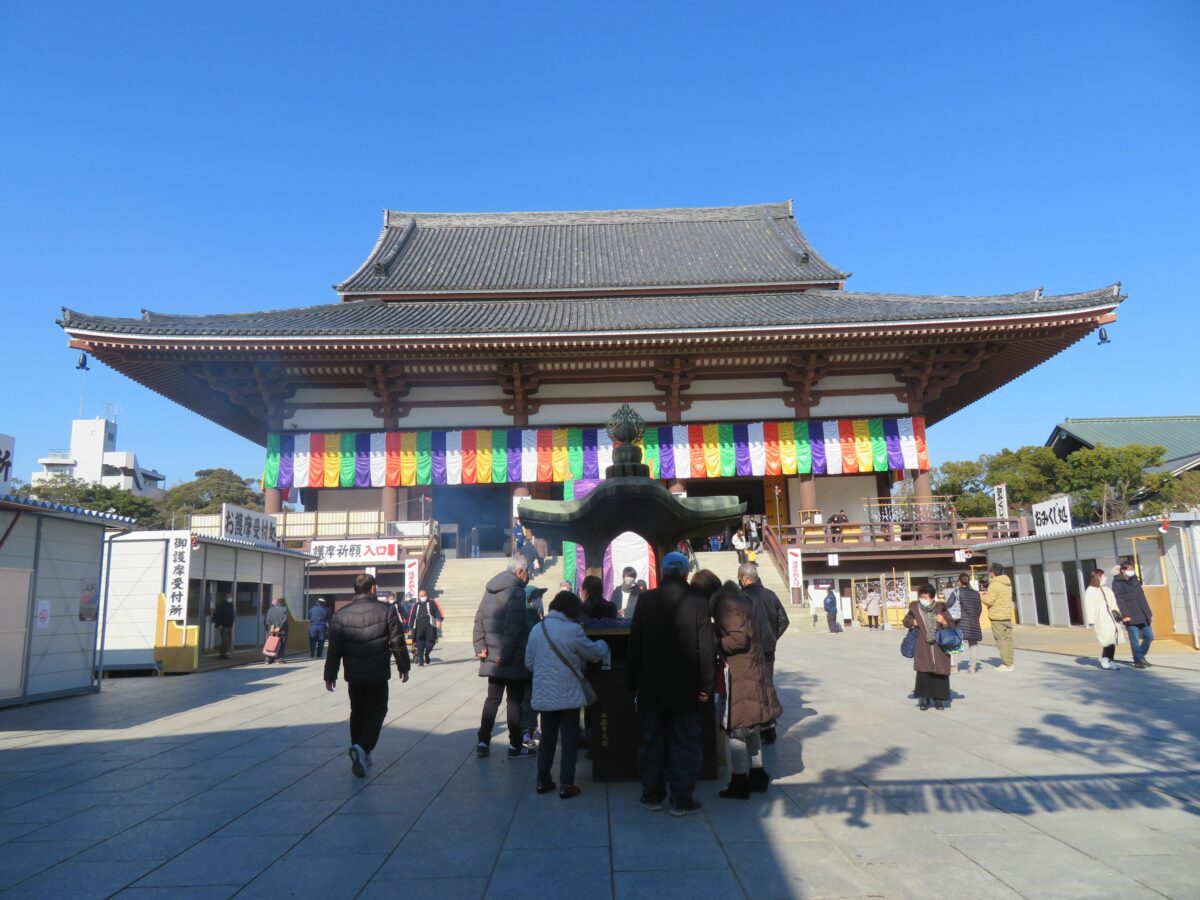 山門を潜ると正面に大本堂の姿を拝むことができます。山門と大本堂を繋ぐ石畳の道の左右には露店が並びます。