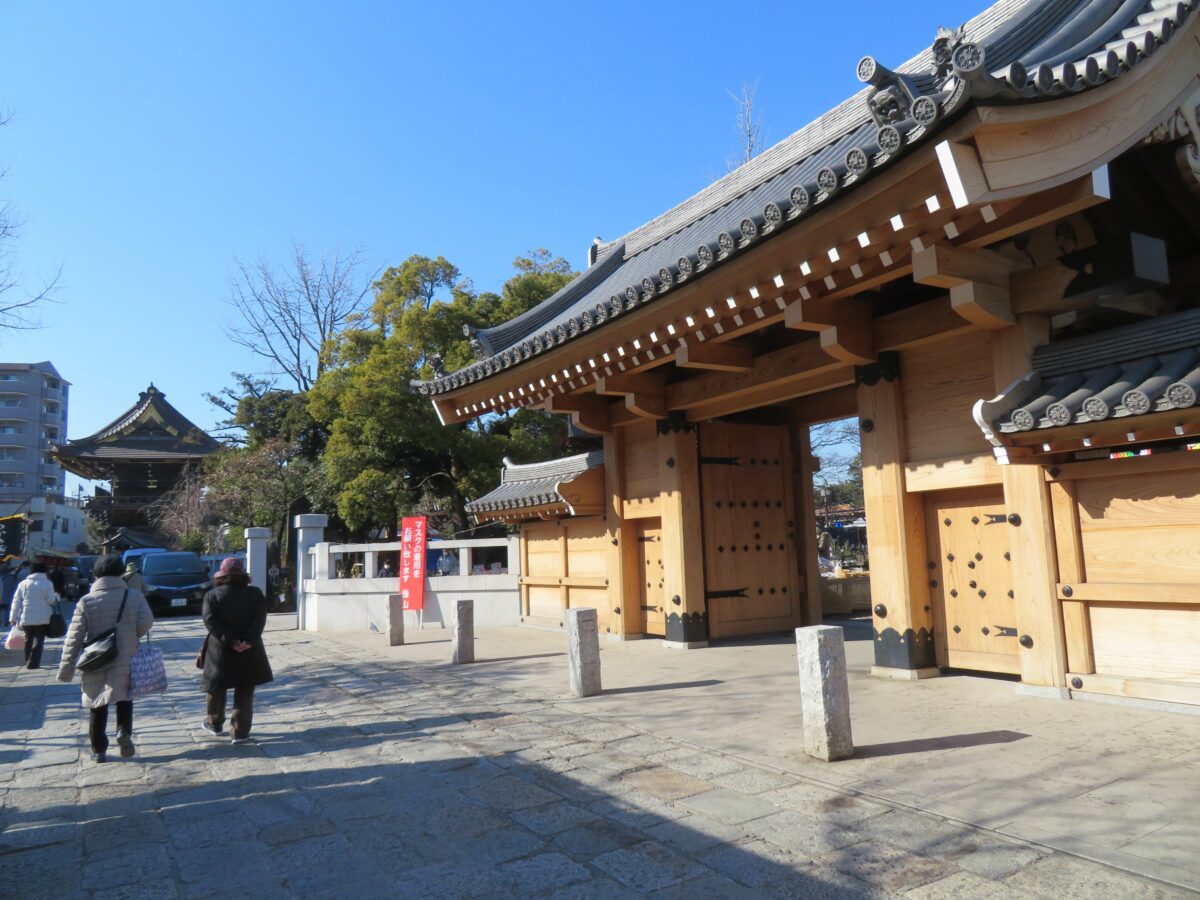 西新井大師の正面玄関にあたるのが山門です。総欅造りの楼門は、建具金物裏面の陰刻から江戸時代後期1833年の建立と推定されています。赤銅色の銅葺屋根が青空にくっきりと浮かび上がります。門の左右には金剛力士像が祀られています。