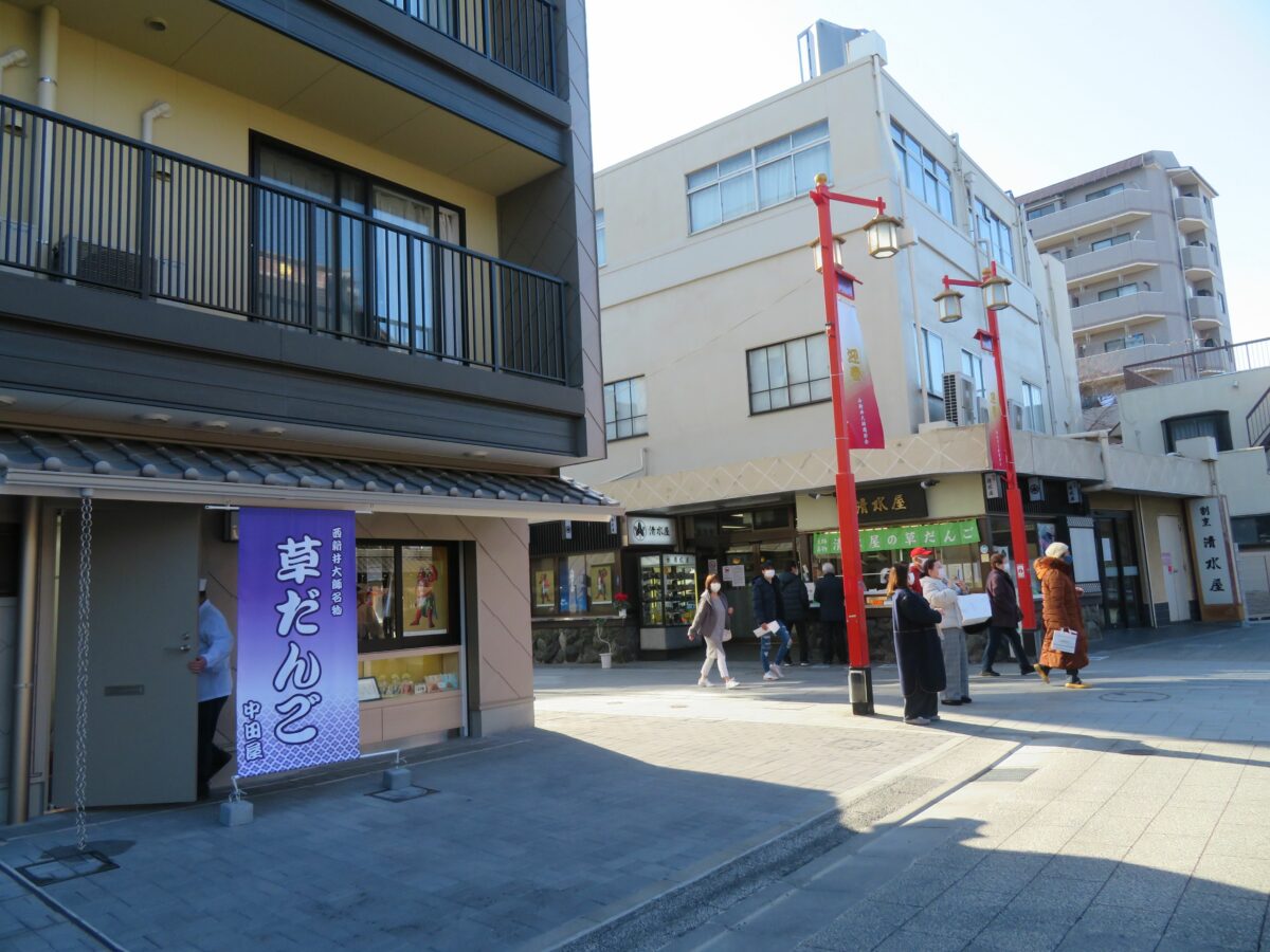 山門前で両脇を固める草だんご店の中田屋と清水屋