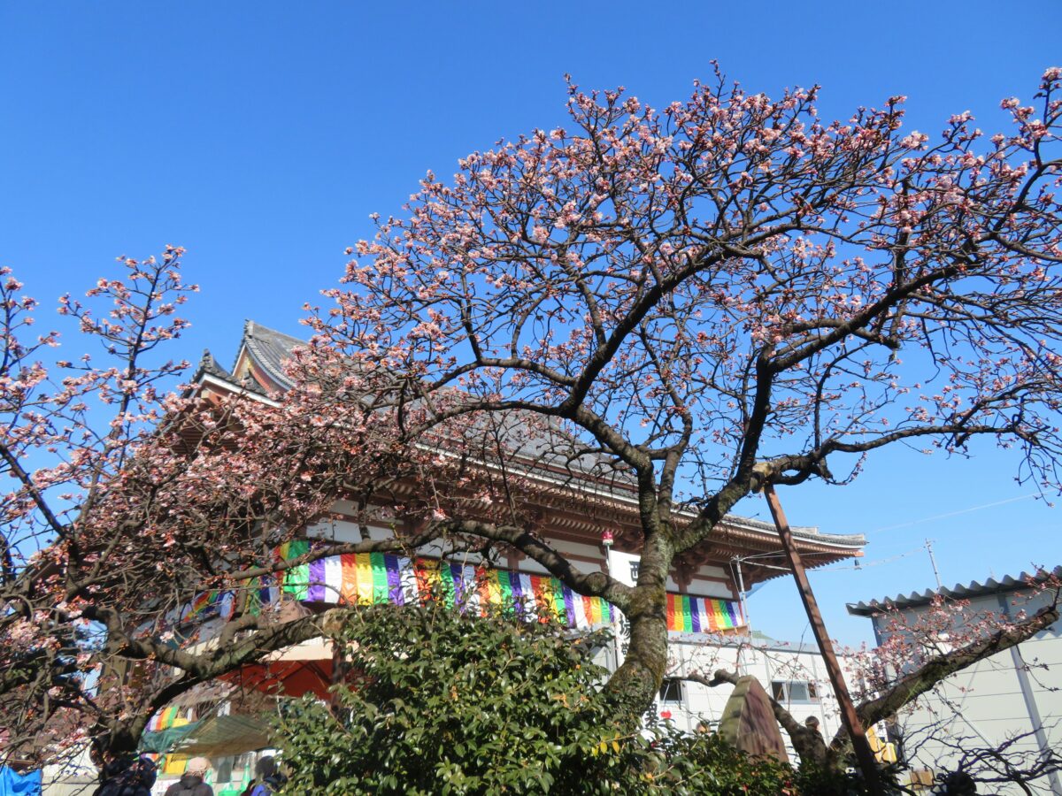 また、三匝堂と大本堂の間では1月の下旬に寒桜が咲き始めています。カンヒザクラ系の雑種で桜の中では最も早く開花し、満開となるのは2月上旬から3月上旬です。