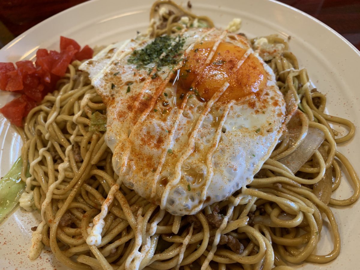 羽後町到着前に横手駅で途中下車して食したランチの「横手焼きそば」。弾力があるモチモチの麺と甘いソースの相性が抜群です。