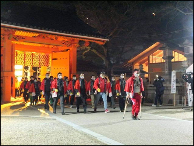 昨年はコロナ禍の影響で「福男選び」は中止。約500人の参拝者はゆっくり歩いて本殿を目指した