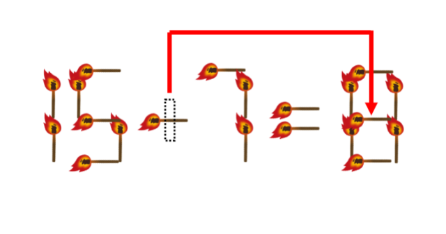 「+」を構成する松明を一本、90度回転させて右の「0」に加えると、「15-7=8」の式が完成します。柔軟な発想が必要な問題でした!