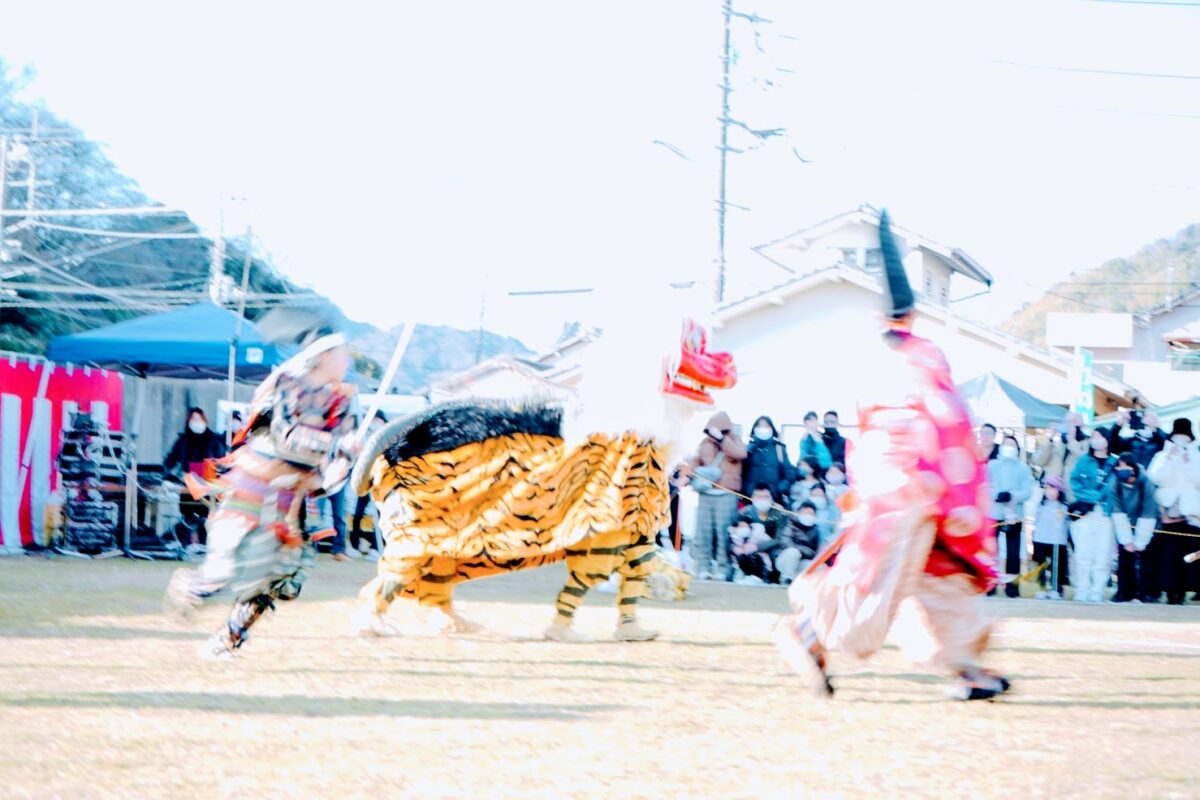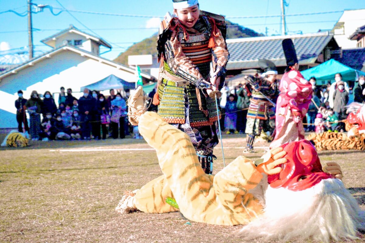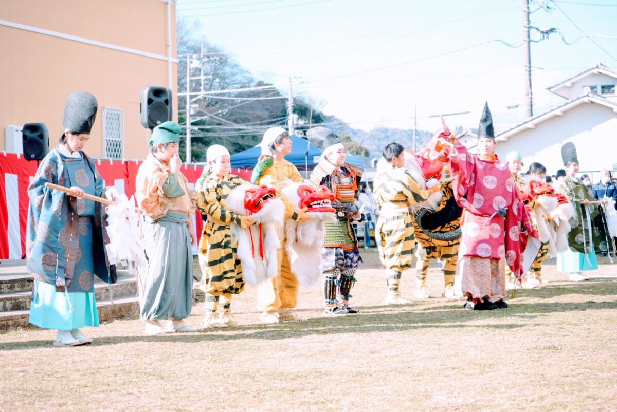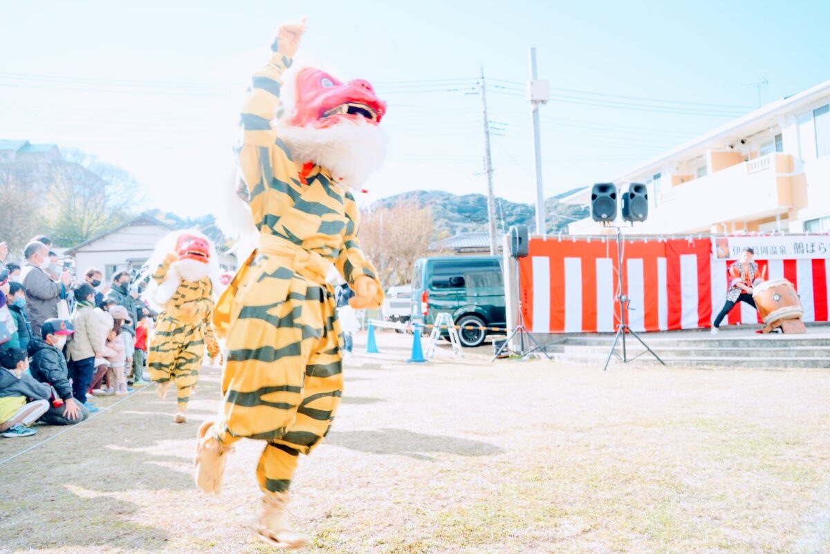 都合2回にわたる「鵺おどり」の他にも、当日は催しが目白押し。弓で鵺を退治した故事にちなんで地元高校の弓道部による弓のデモンストレーションが実施された他、豆まきや伊豆長岡芸妓連による踊りの披露、最後は餅まきでフィナーレとなりました。