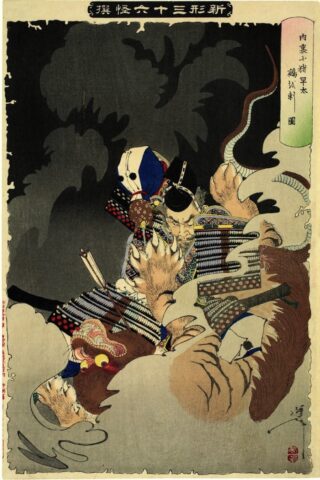 月岡芳年「内裏に猪早太鵺を刺圖」