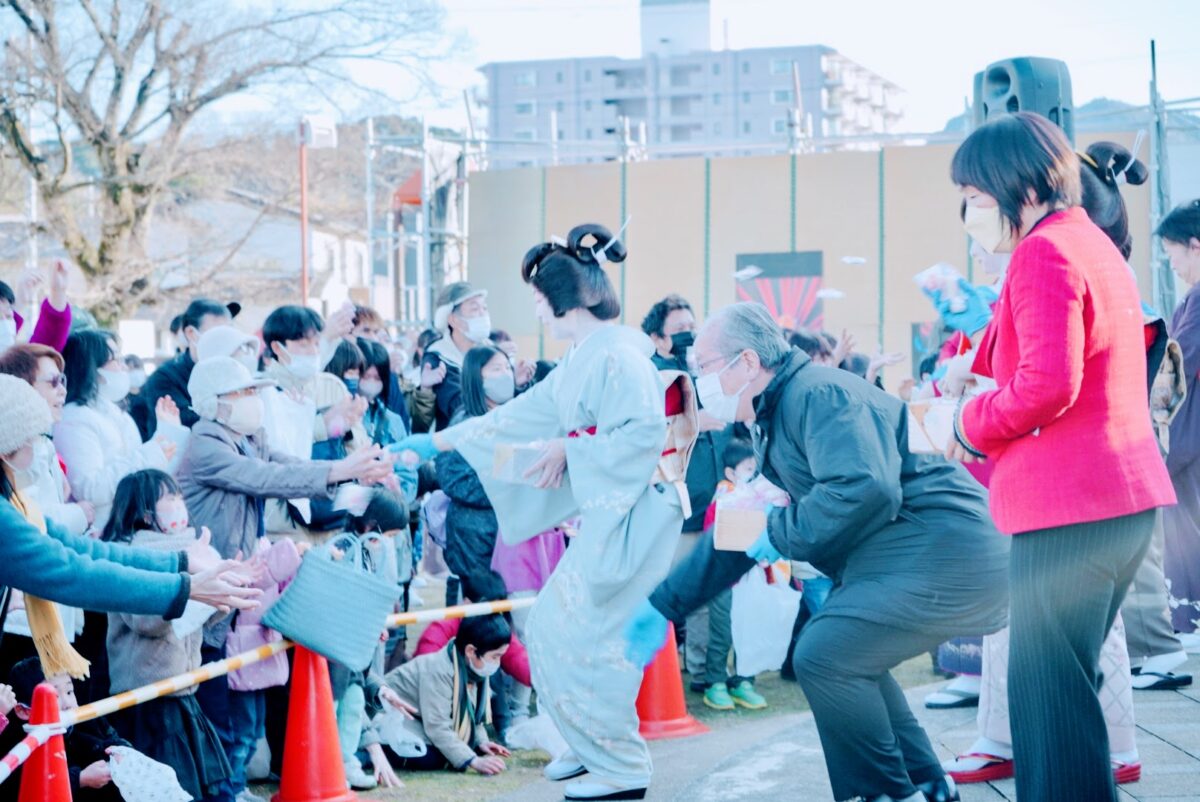 都合2回にわたる「鵺おどり」の他にも、当日は催しが目白押し。弓で鵺を退治した故事にちなんで地元高校の弓道部による弓のデモンストレーションが実施された他、豆まきや伊豆長岡芸妓連による踊りの披露、最後は餅まきでフィナーレとなりました。