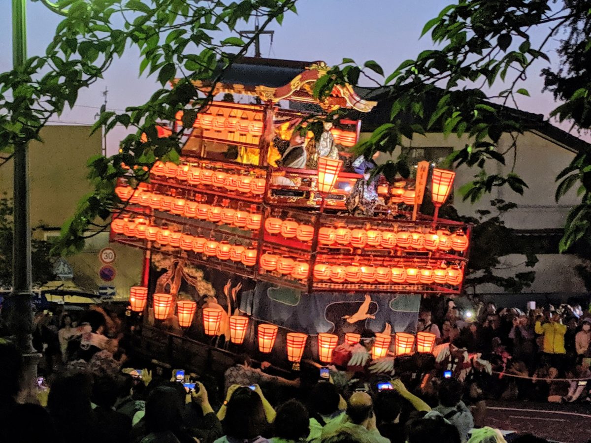 昼に町を巡行したあとに、夜は八幡神社に集合し提灯を灯して最後の巡行を行います。
