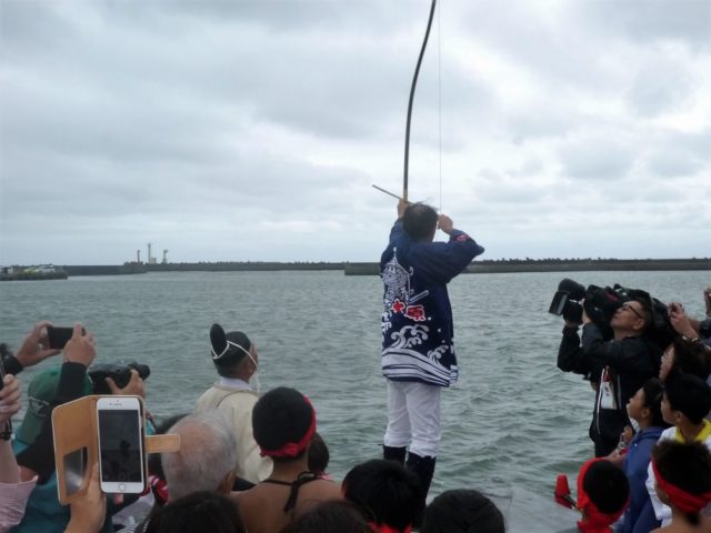神主さんがお祓い、祝詞をあげると、最後に「二矢放流の儀」。いすみ市長が五穀豊穣と大漁満足を祈って、波止場から海に向かって2回矢を放ちます。潮風のなか何もない海へと弓を引く姿には、そこに「海の神様」がいること、昔から続く大原の漁の暮らしを感じずにはいられません。