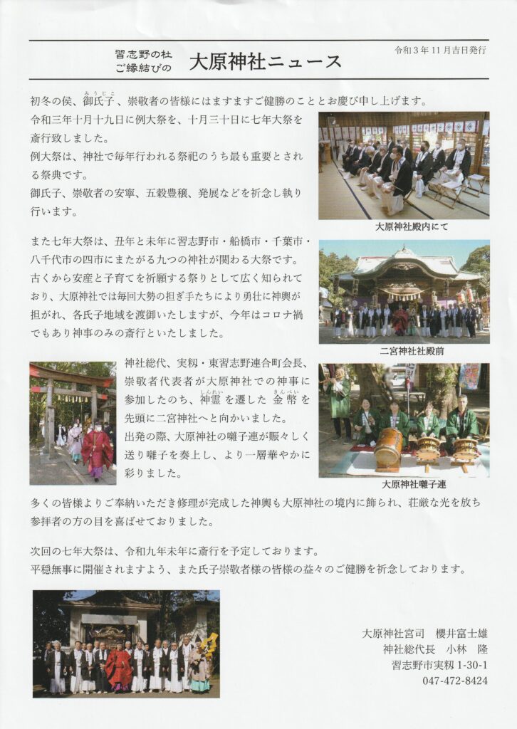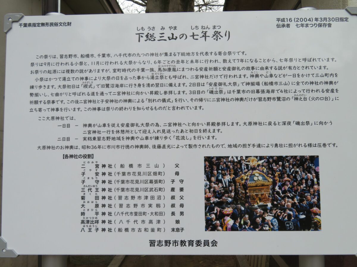 境内には「下総三山の七年祭り」の紹介ボードが設置され、授与処で配布される「大原神社ニュース」には、2021年の祭の様子が詳しく報告されています。