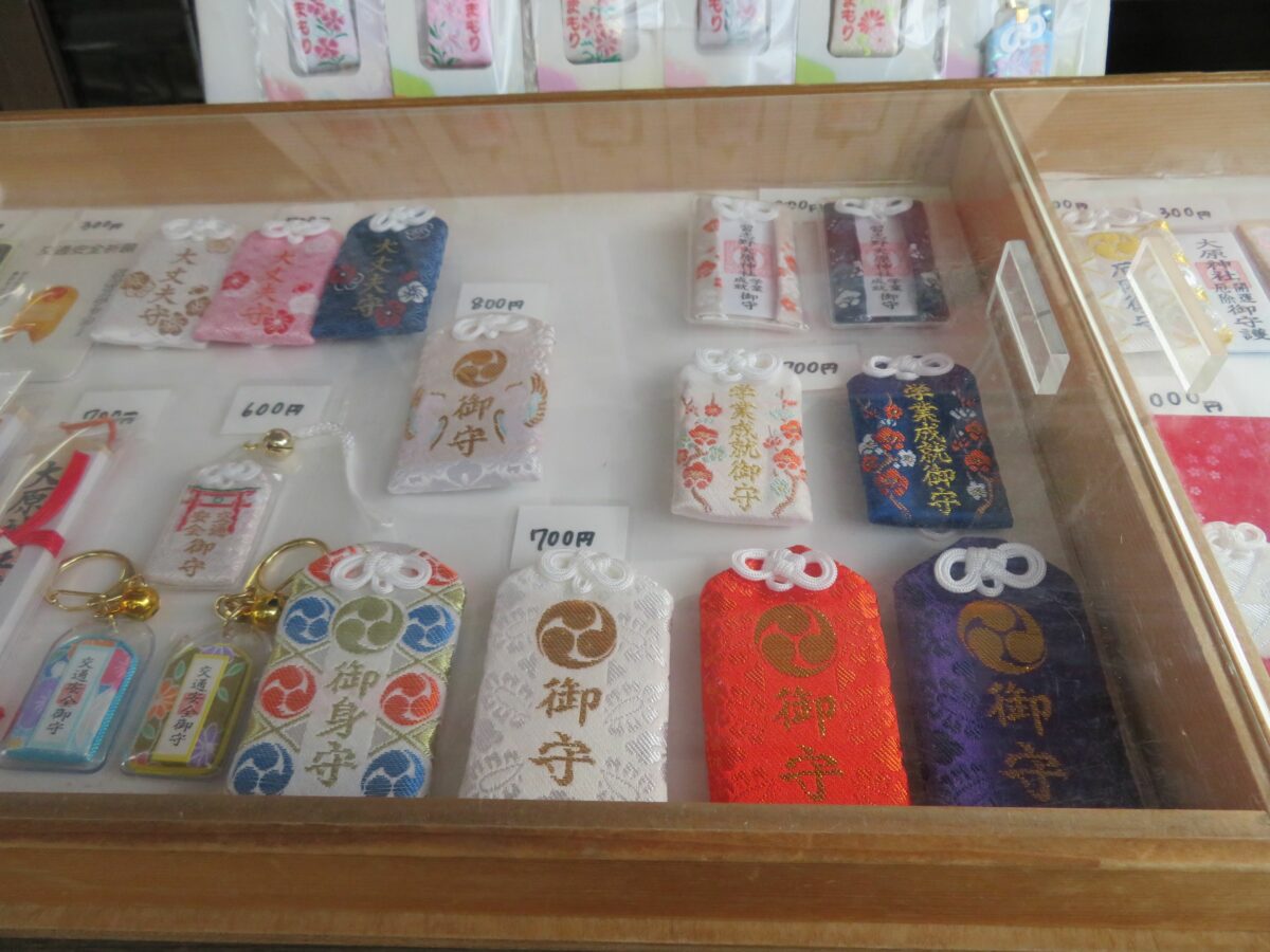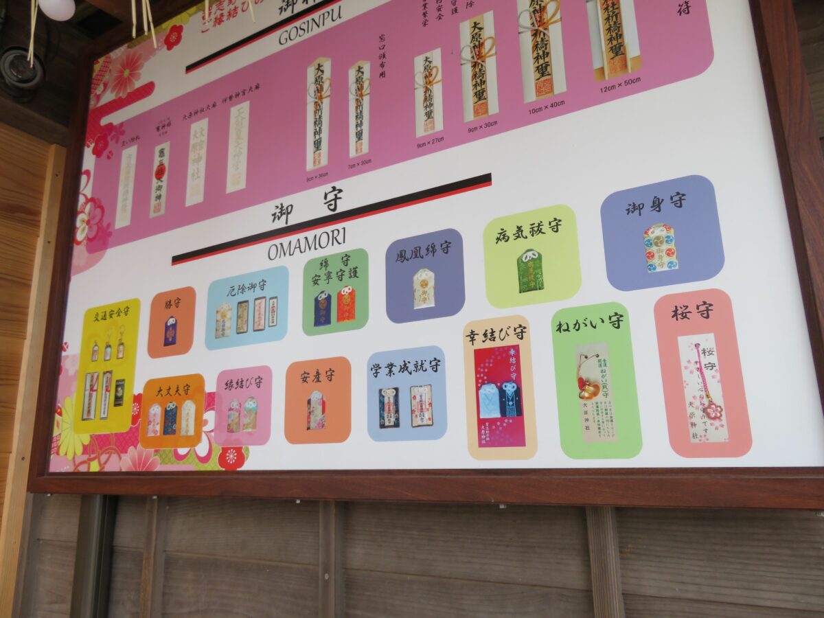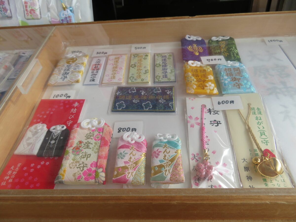 大原神社では拝殿の西面の授与処で御朱印が頒布されています。窓口にはお守りなどの授与品も種類豊富に揃っています。