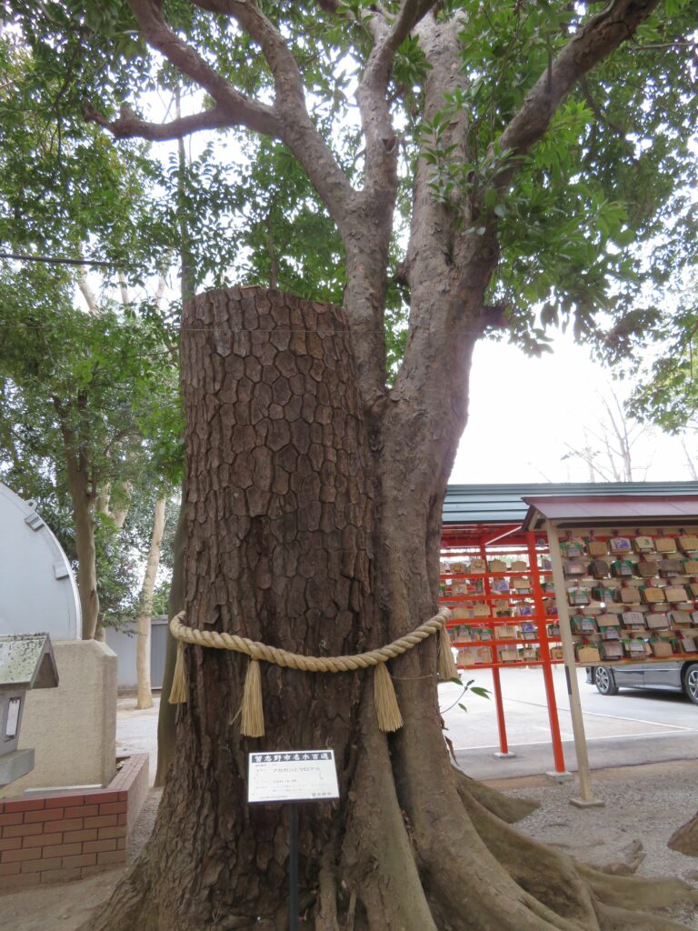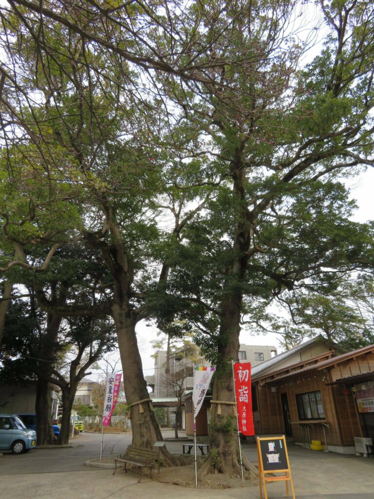 境内には幹を寄り添わせる夫婦タブノキや、アカガシとクロマツなどが育ち、参拝者に縁結びのパワーを授けています。