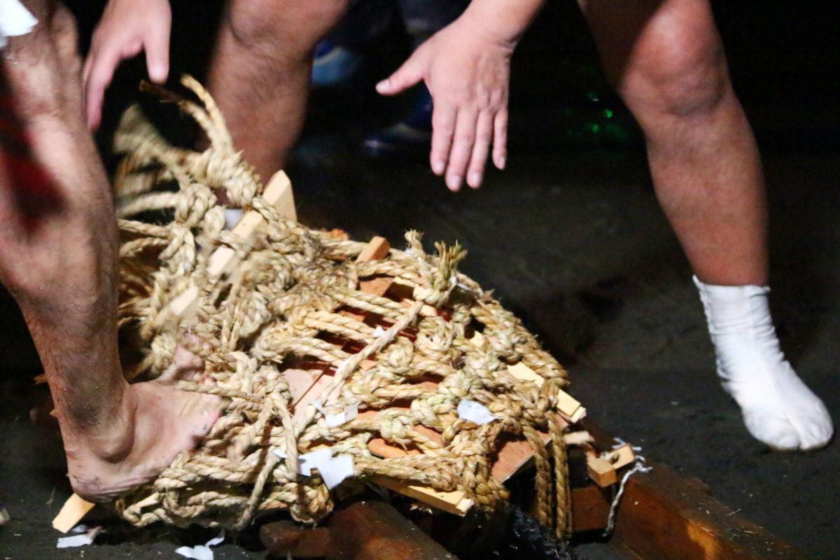 セエトが燃え盛ったところではじまるのが、大磯の左義長のクライマックス「ヤンナゴッコ」です!ヤンナゴッコとは、災いを封じ込めた仮宮をふんどし一丁の男衆が浜と陸(おか)に分かれて引っ張り合う、言わば綱引き!まずは歌を歌いあげて、気合を入れていきます!