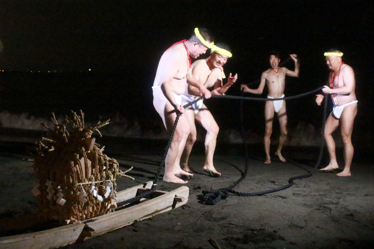 さあ、羽織を脱いで名実ともにふんどし一丁!船に乗せた仮宮を海の中へと引き入れていきます。