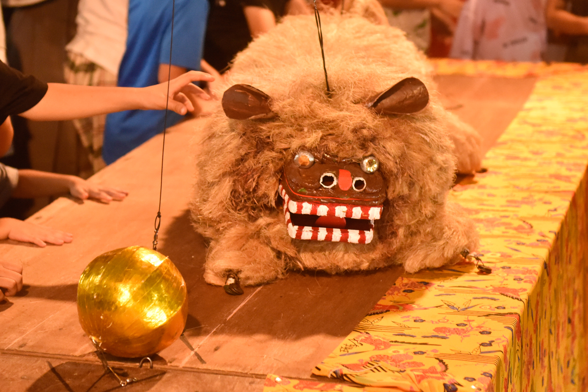 この獅子舞は獅子の頭部と臀部に一本の糸を結びつけ、舞台天井の竹や棒に渡して、舞台裏から操る仕組みとなっており、非常に珍しい形態だ。謝名では豊年祭の最後の演目として、操り獅子を拝見した。左の雌獅子と右の雄獅子がマリに向かい合ってじゃれあっていて、それが途中からヒートアップするという流れだった。雄と雌で少し動きが違うことも興味深かった。