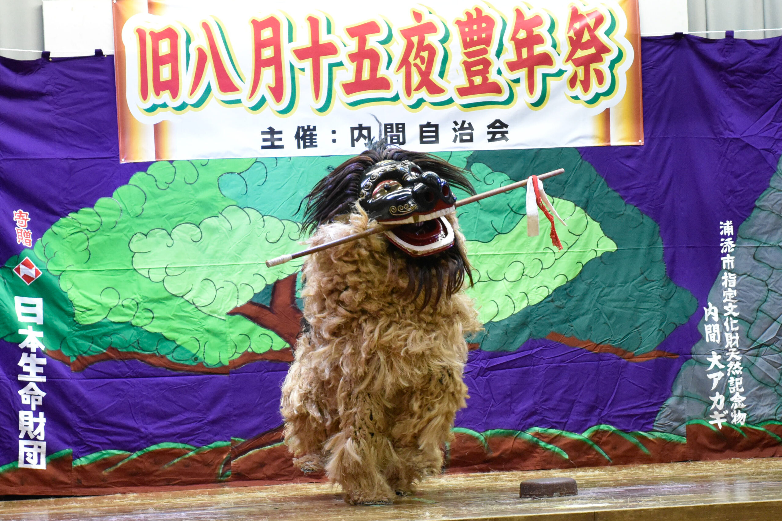 この獅子舞は雌獅子だ。昭和51年に結成された獅子舞保存会によって継承保存されている。昭和56年には浦添市の無形民俗文化財に指定。内間の獅子舞の主な演目は、ザーミーメー(モーヤー)、マーイムタバー、ケーヤー小、シラングィー、ボークーヤー、カジシヤー、ホーヤー小、ヒジタテヤー(肘を立て、遊ぶ演技)、サールー小(獅子が猿を追いかける)である。