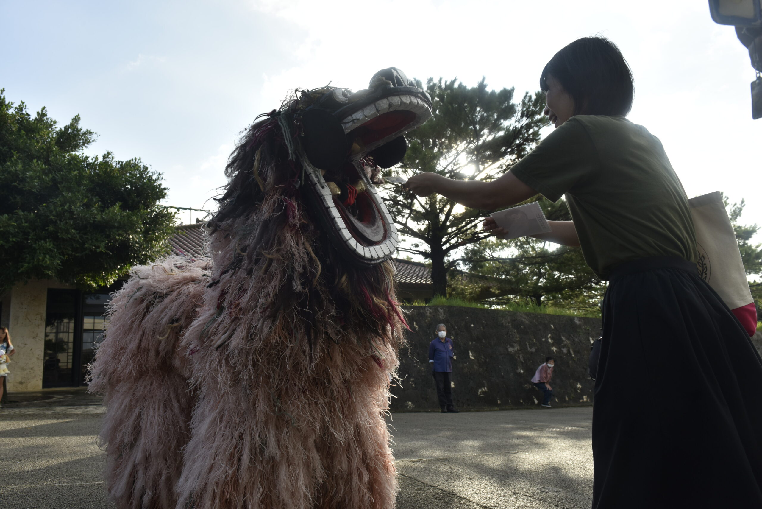 道中獅子に頭を噛んでもらう時間があり、時にはギャーと泣き叫ぶ子どももいて、子どもには怖いよなということを改めて感じた。沖縄特有の細い路地を大きな獅子舞がぐんぐん進んでいき、向こうから来る車やら人を通せんぼしている姿が印象的だった。家周りの時に玄関先で封筒に包まれたご祝儀が獅子の口に入れられて、それによって舞ってくれるという場合と、通りすがりの人、例えば車から降りて封筒を渡す人なども見られて気軽にご祝儀を渡している感じがとても良かった。