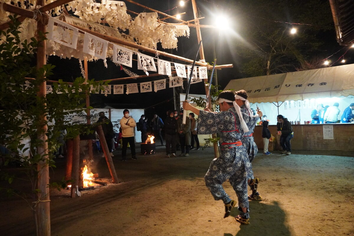 多くの地区が屋内で開催される中、河内地区は屋外で行われるため開放的な雰囲気。「癒しの花祭」と言われるほど、比較的静かに祭が進行します。