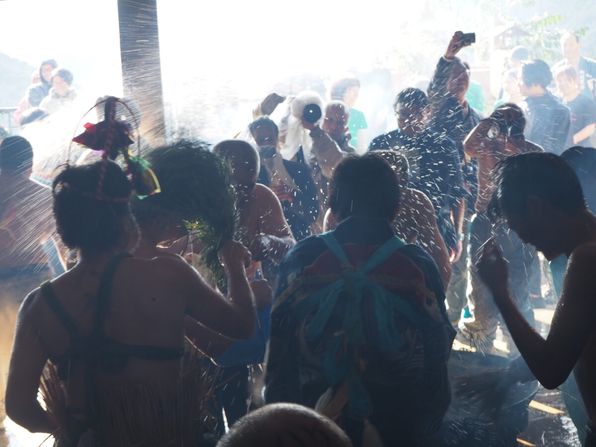 この湯は「生まれ清まりの産湯」とも言われ、浴びると無病息災で過ごせるとされるため、舞が終わるころには皆びしょびしょ!会場のあちこちから悲鳴にも似た歓声がこだまします。