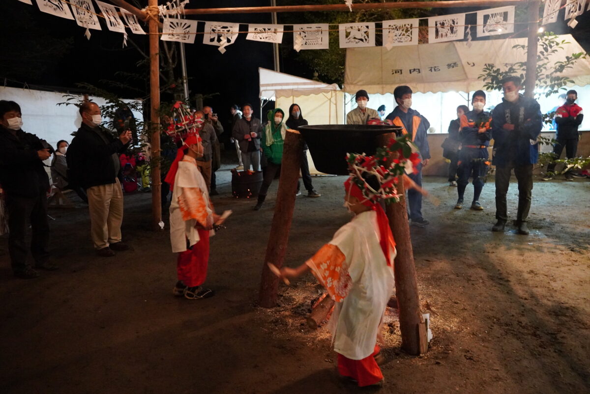多くの地区が屋内で開催される中、河内地区は屋外で行われるため開放的な雰囲気。「癒しの花祭」と言われるほど、比較的静かに祭が進行します。