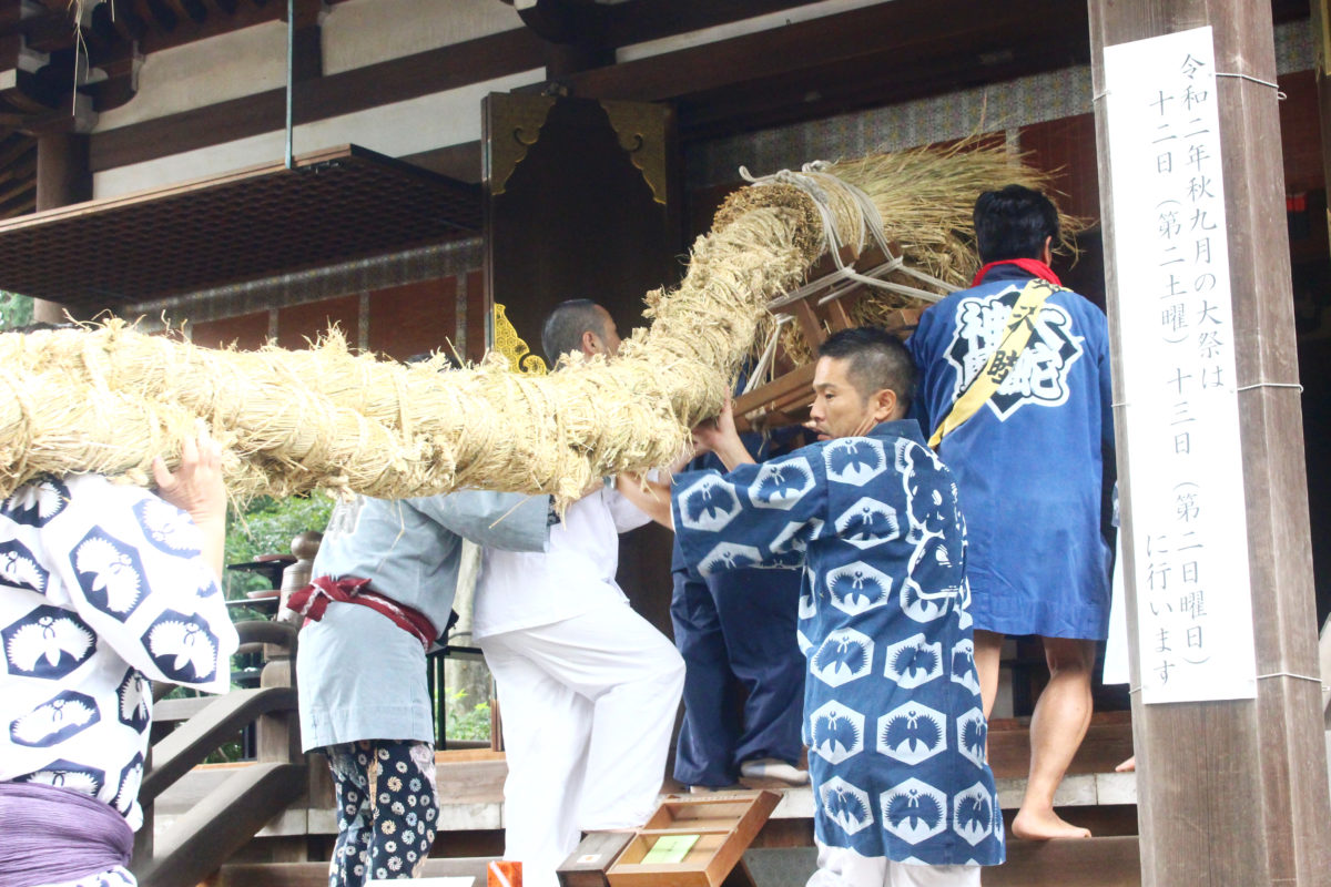 先ほど宮入を終えた大蛇は1年間拝殿に安置され、その後この鳥居のしめ縄となります。なので目の前にいるこの大蛇は、2年前のお祭りで町を練り歩いた大蛇になります!