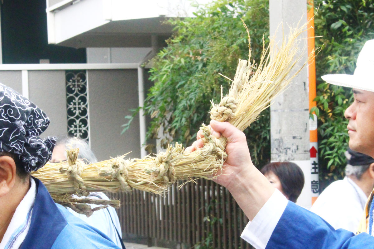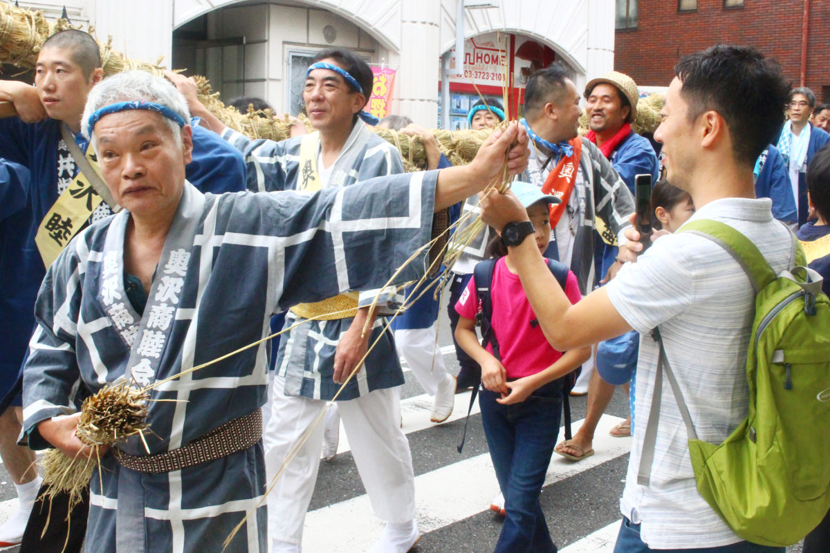 途中このように藁を配りながら進みます。藁を手に入れると、ご利益がもらえるんだとか!