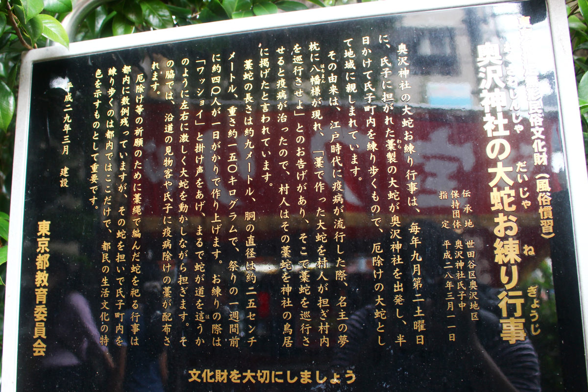 大蛇のお練り行事は、東京都の無形民俗文化財にも登録されているお祭りです。奥澤神社の由緒は室町時代にまで遡り、世田谷郷東部の守護神として建立されたのだとか。そして時代は下り江戸時代中期。域内で疫病が発生した際に、名主の夢枕に現れた八幡様(奥澤神社の神様)のお告げによってはじまったお祭りなんだそうです。なので奥澤神社の大蛇は、別名「厄除大蛇」とも呼ばれています!