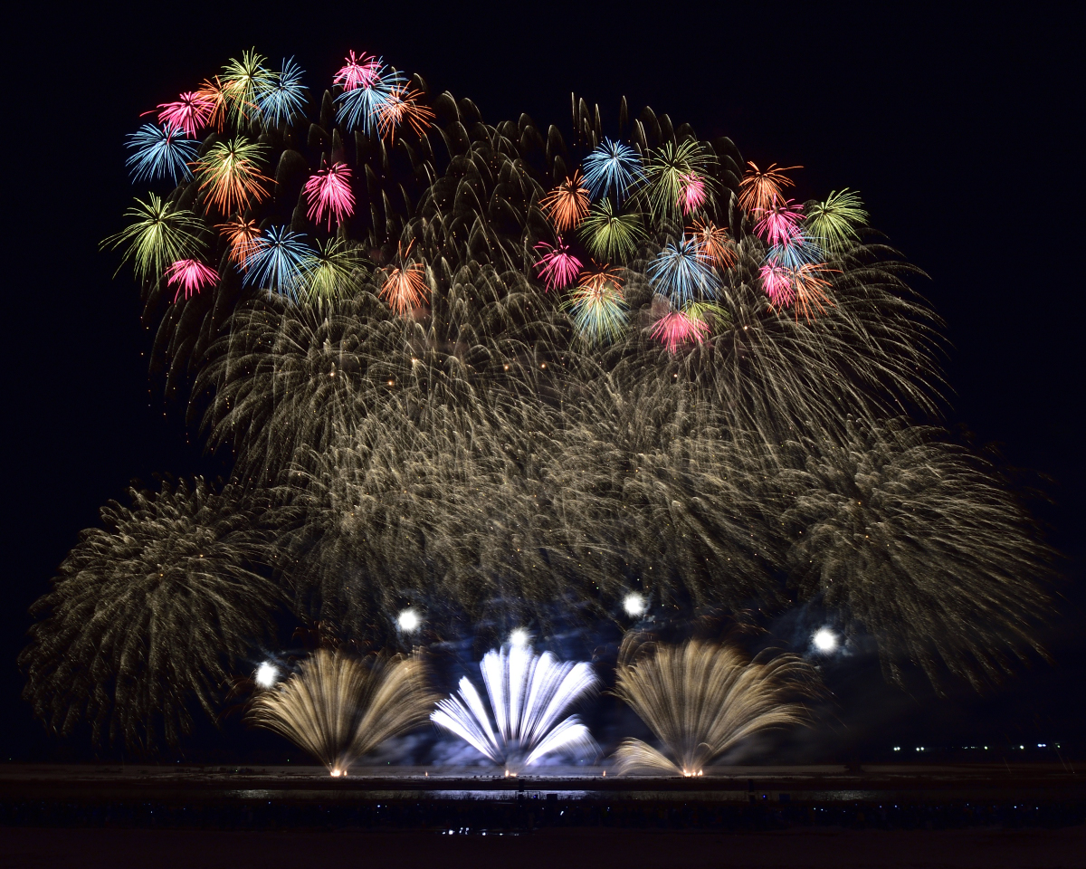 花火の種類、配置、シーンの切り替え、それらが見事に調和した創造花火の世界。