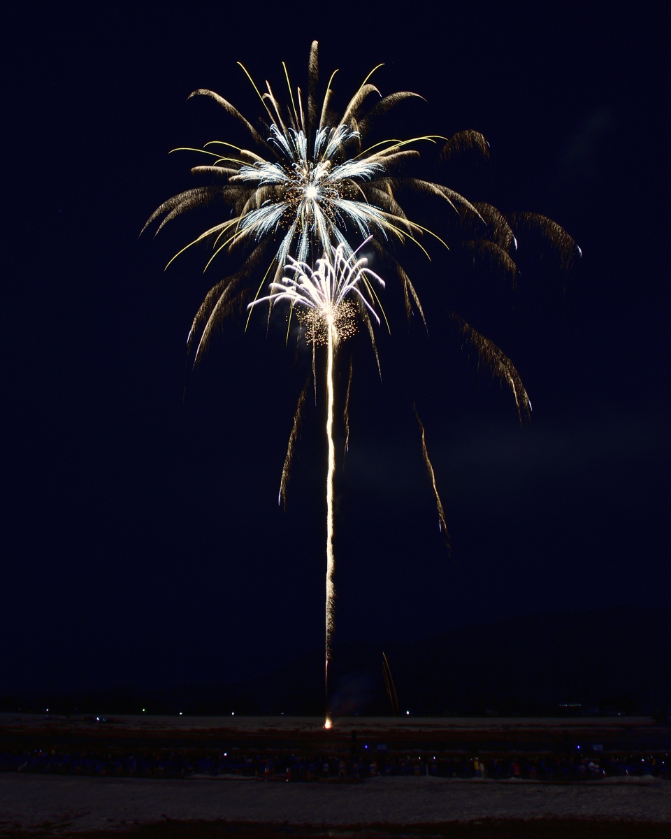 降砂菊: 金色の砂が空から降ってくるように、和火の昇った跡が金色になってゆく花火