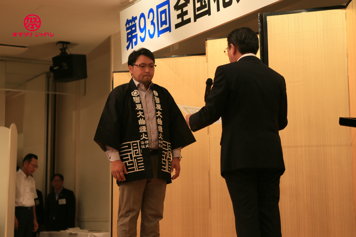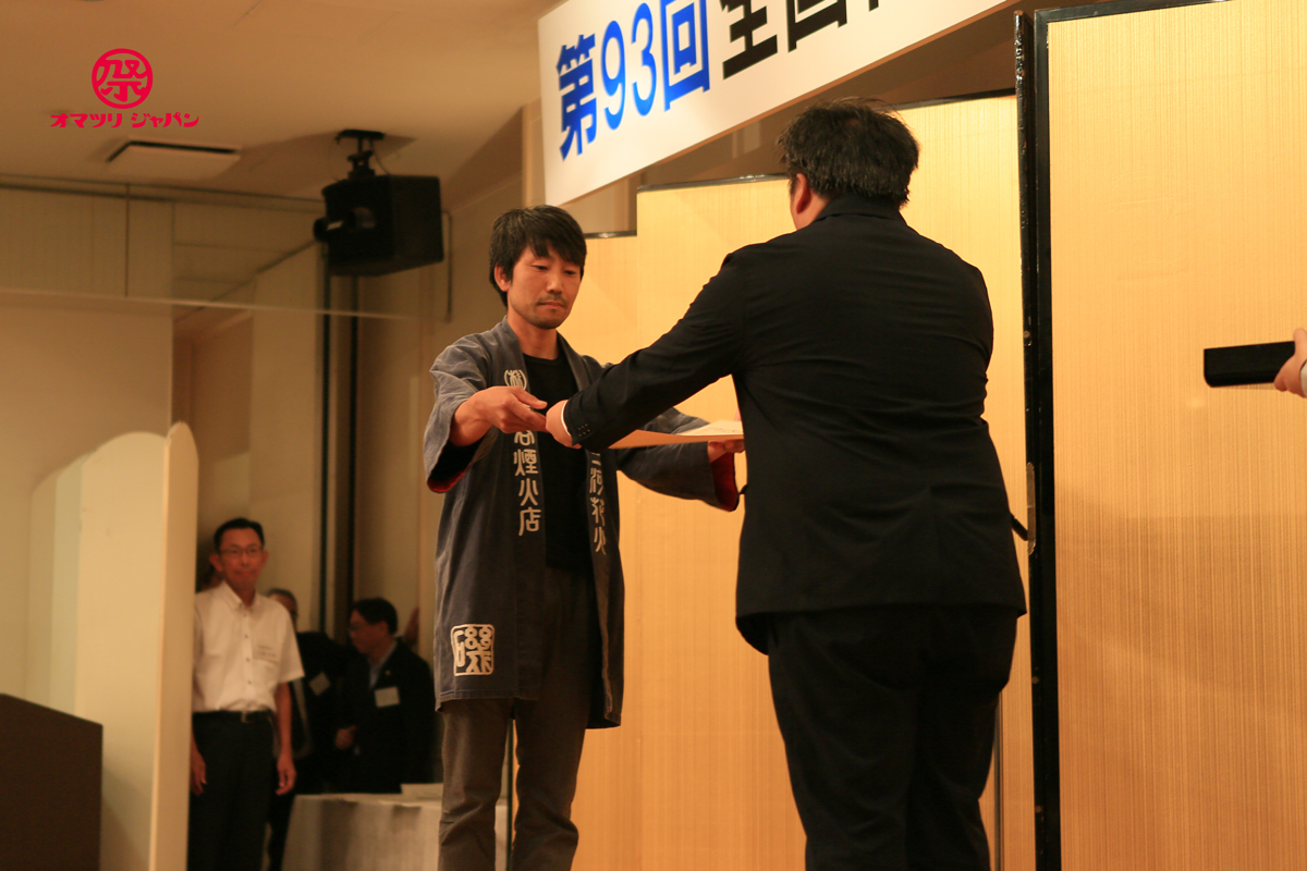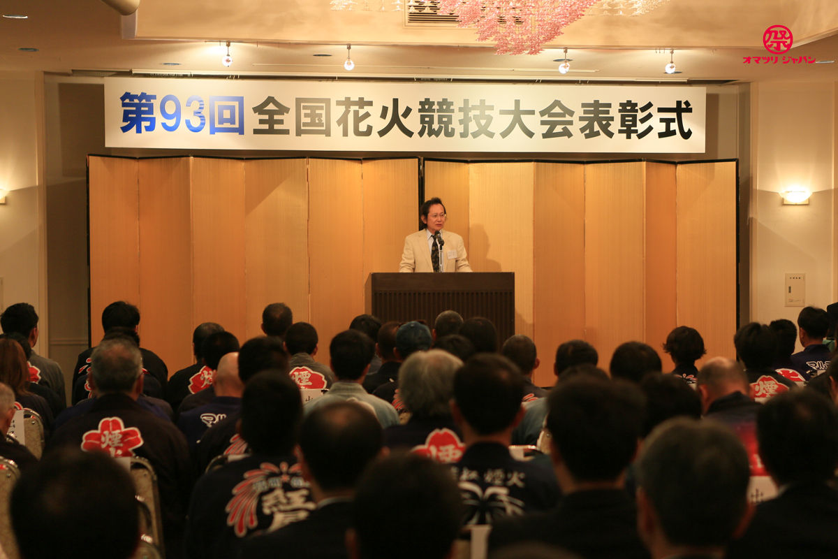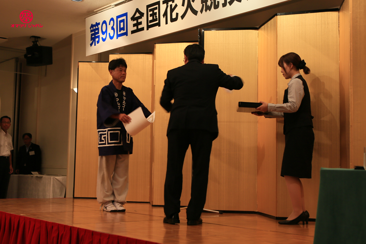 関係者による挨拶の後、各4部門の優勝、準優勝の煙火店は壇上に上がり賞状やトロフィーなどを受け取りますが、優秀賞、入賞は時間の関係でその場で立ち一礼。総合優勝者である内閣総理大臣賞の煙火店は何度も壇上に上がる必要が出てくるので、あらかじめ出やすい様に席順が決められています。