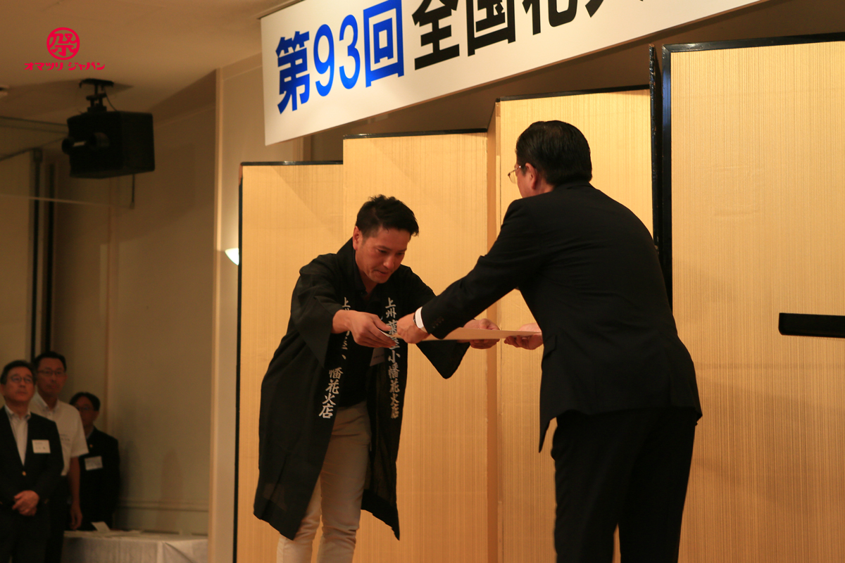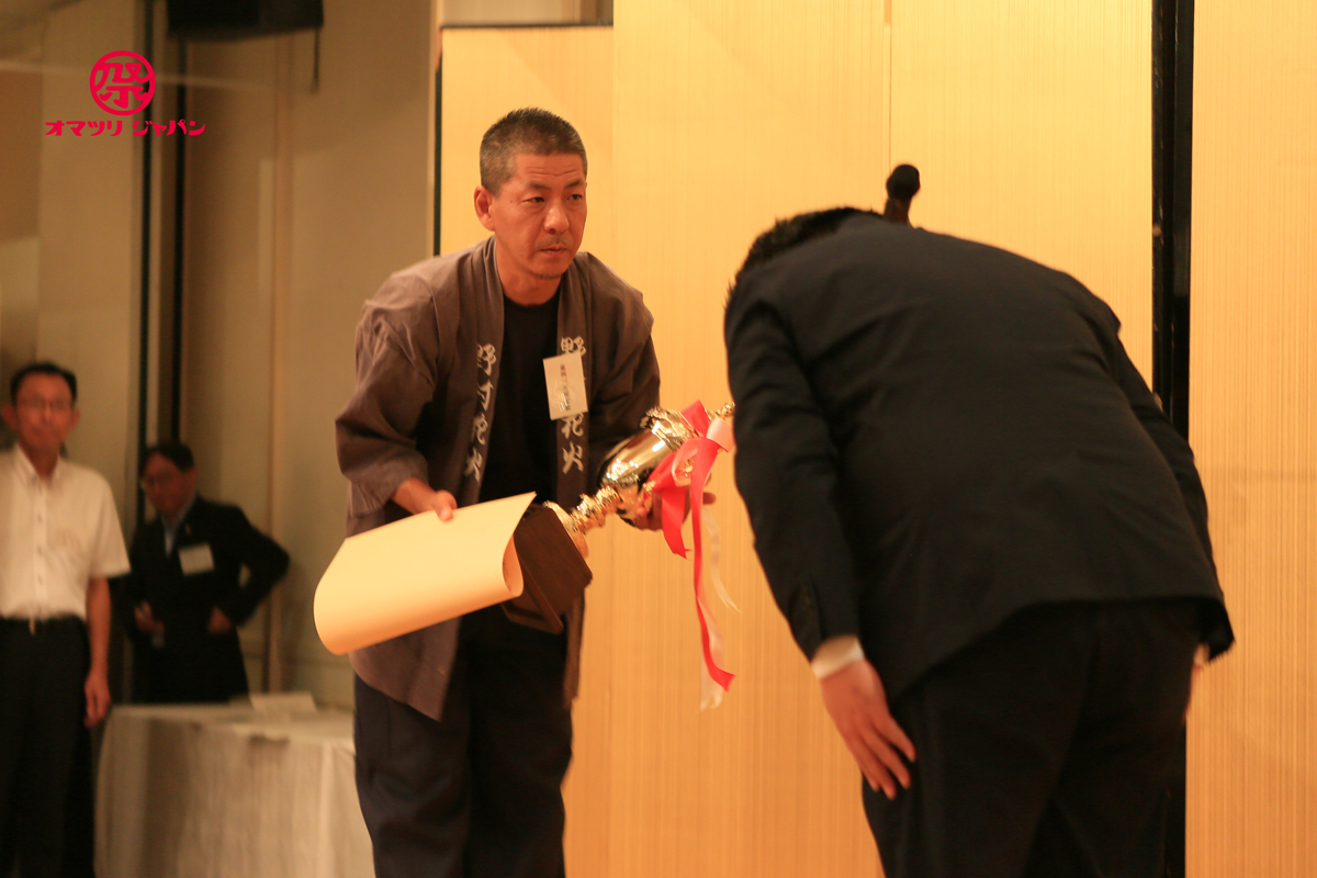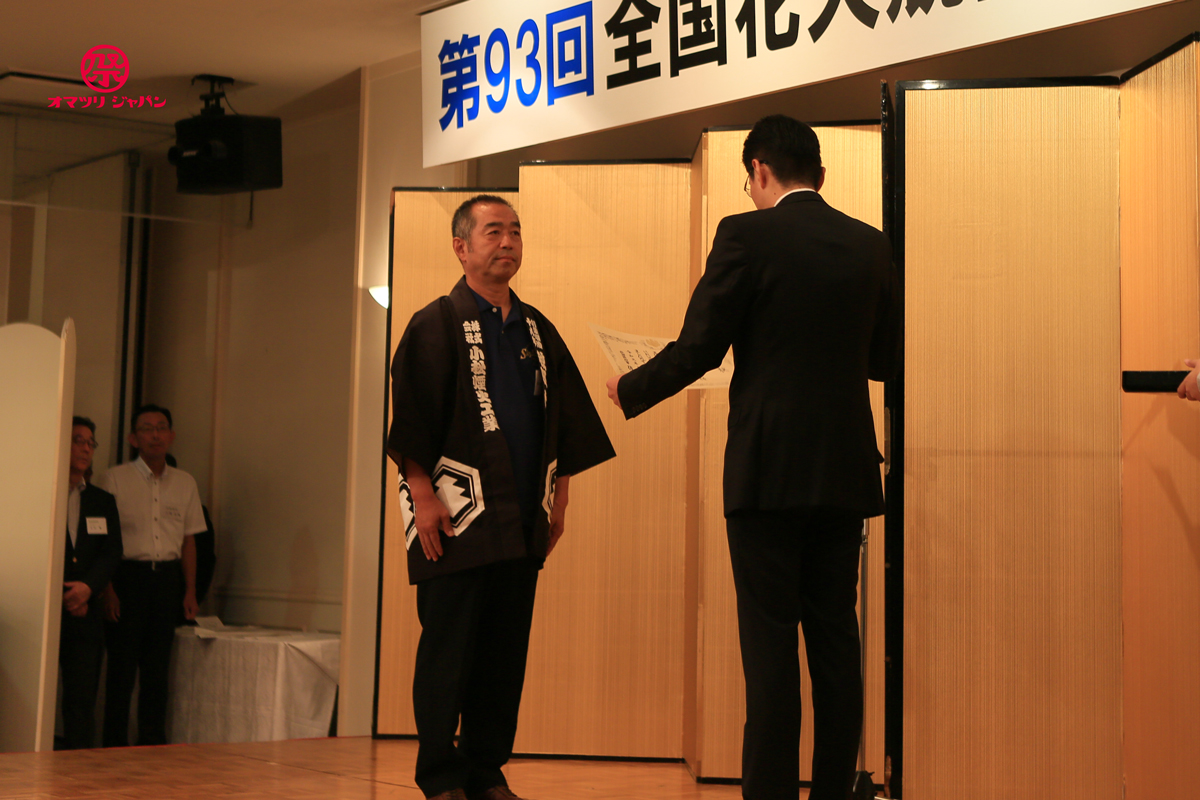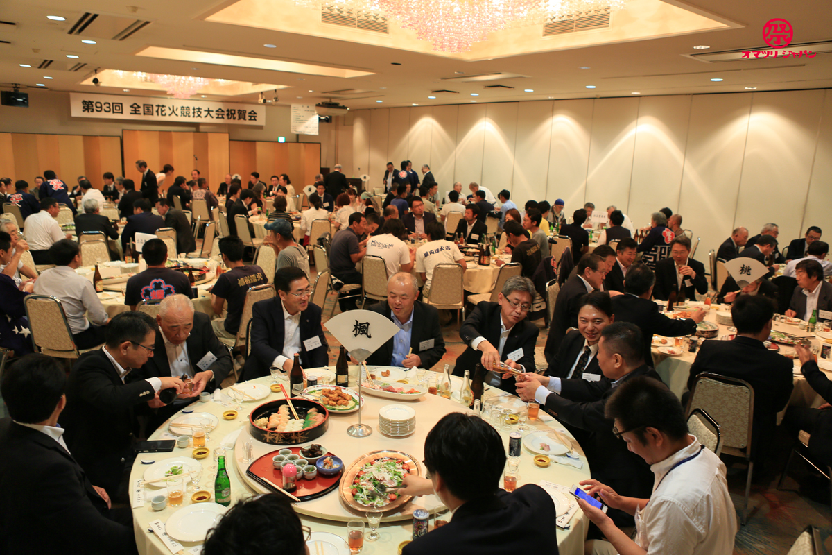 関係者による挨拶の後、各4部門の優勝、準優勝の煙火店は壇上に上がり賞状やトロフィーなどを受け取りますが、優秀賞、入賞は時間の関係でその場で立ち一礼。総合優勝者である内閣総理大臣賞の煙火店は何度も壇上に上がる必要が出てくるので、あらかじめ出やすい様に席順が決められています。