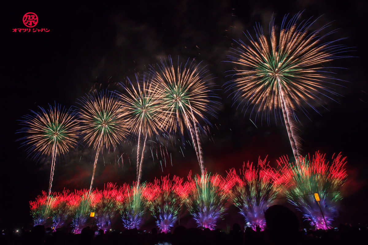 幅900mを使ったワイドミュージックスターマイン。おそらく大曲の花火に見に来るほとんどの観客が目的としている大会提供プログラムになります。今年は新たな挑戦として、地元の劇団であるわらび座による監修で花火を使ったミュージカルが行われました。