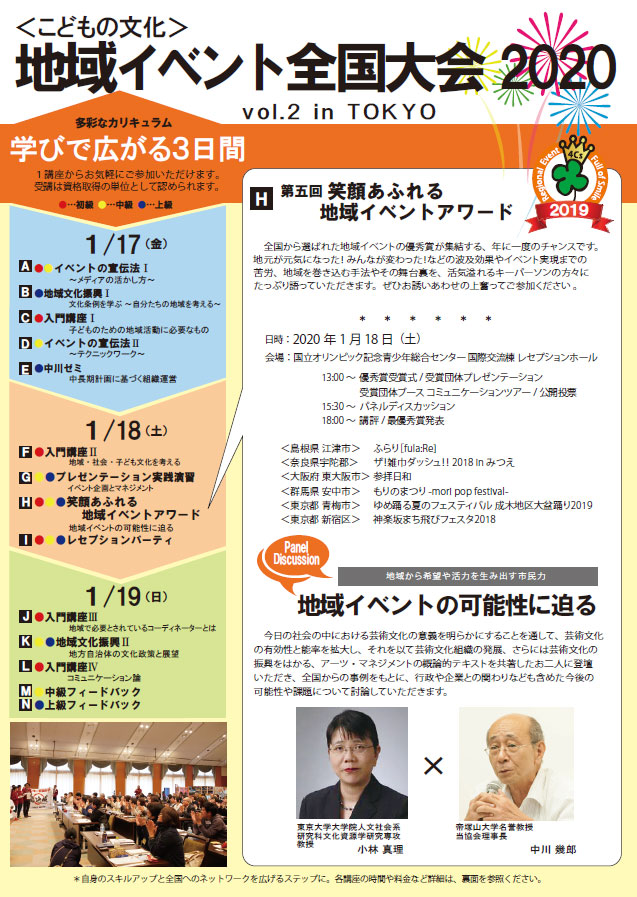 2020年1月18日、東京都渋谷区にて「第五回 笑顔あふれる地域イベントアワード」が開催されました!このイベントは、NPO法人 子ども文化地域コーディネーター協会が、日本全国の地域イベントに光をあて、社会的価値や地域コミュニティ活性化を目的として開催する表彰制度です。この記事では、同イベントにて行われたパネルディスカッション「地域イベントの可能性に迫る」より、パネラーとして登壇した中川幾郎さん、小林真理さんのお話を紹介させていただきます。