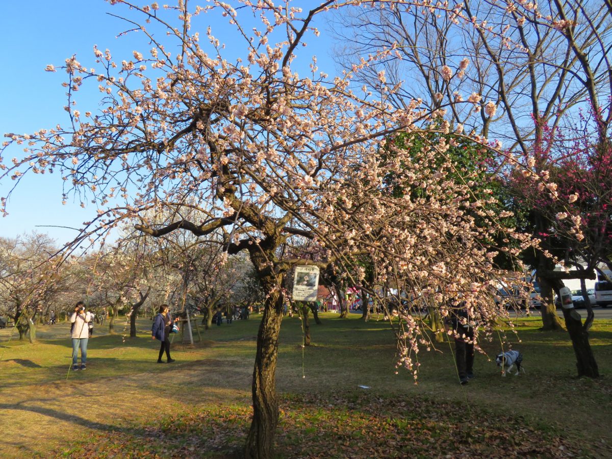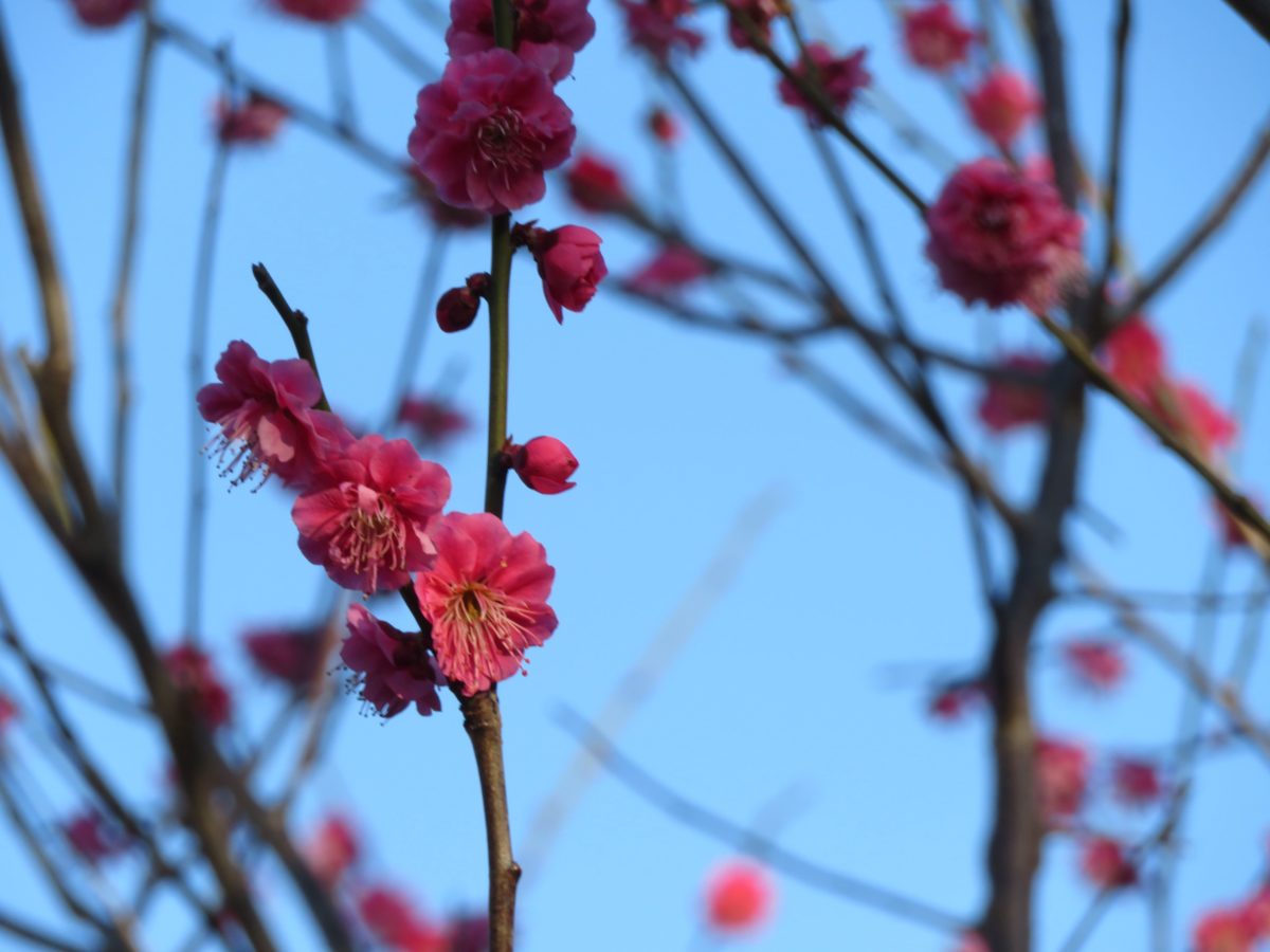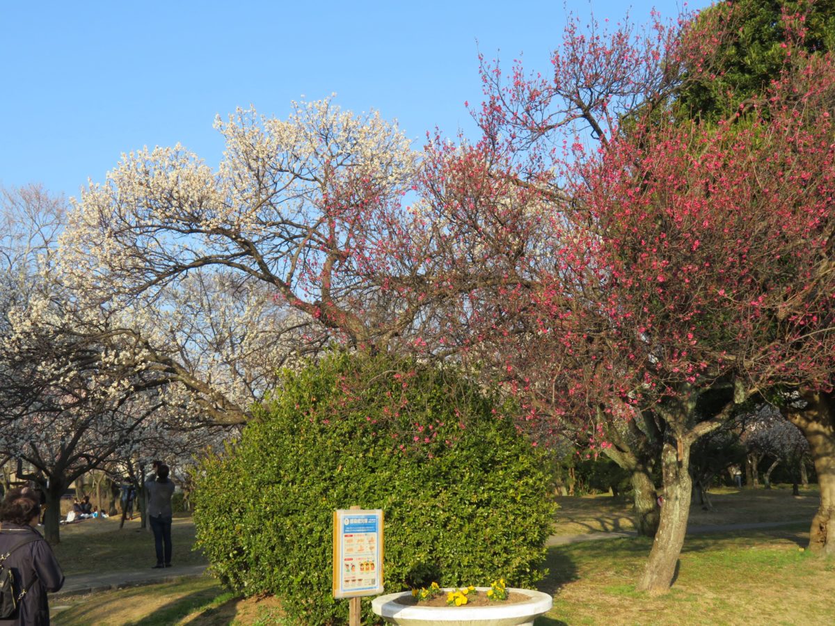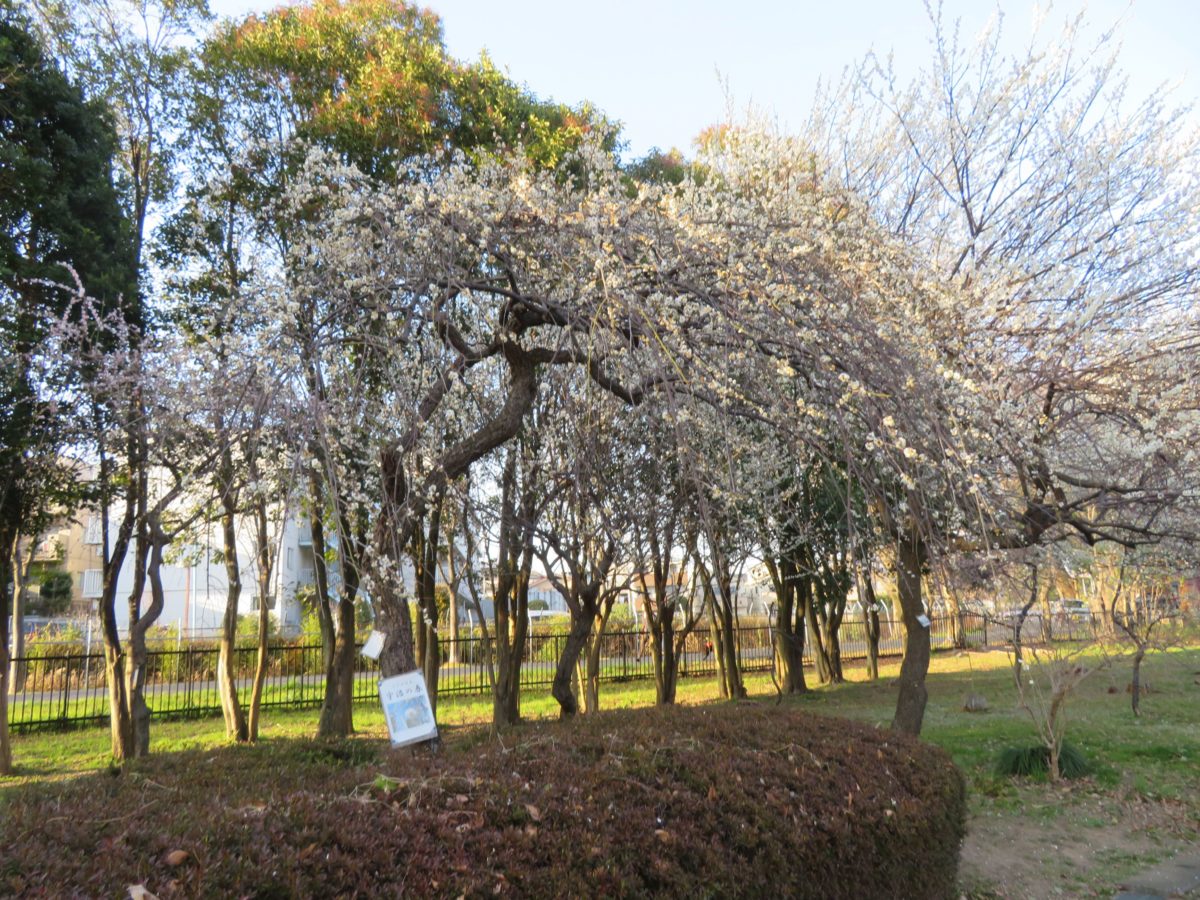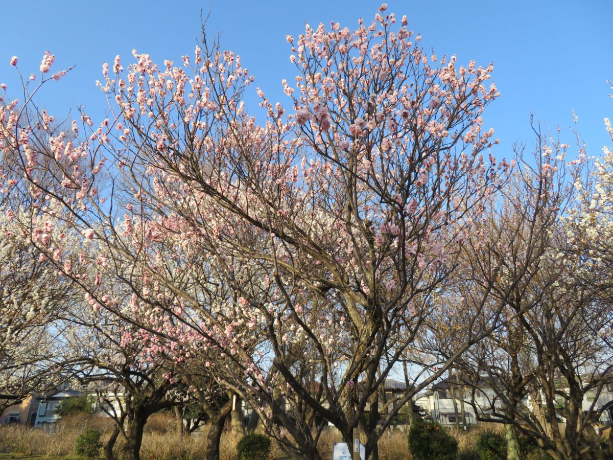 大宮第二公園では約40品種約500本の梅が園内の北西端近くの梅林で育っています。早咲きの紅梅は12月下旬頃に開花を始めますが、梅林全体が色づき見頃となるのは2月中旬から3月中旬です。