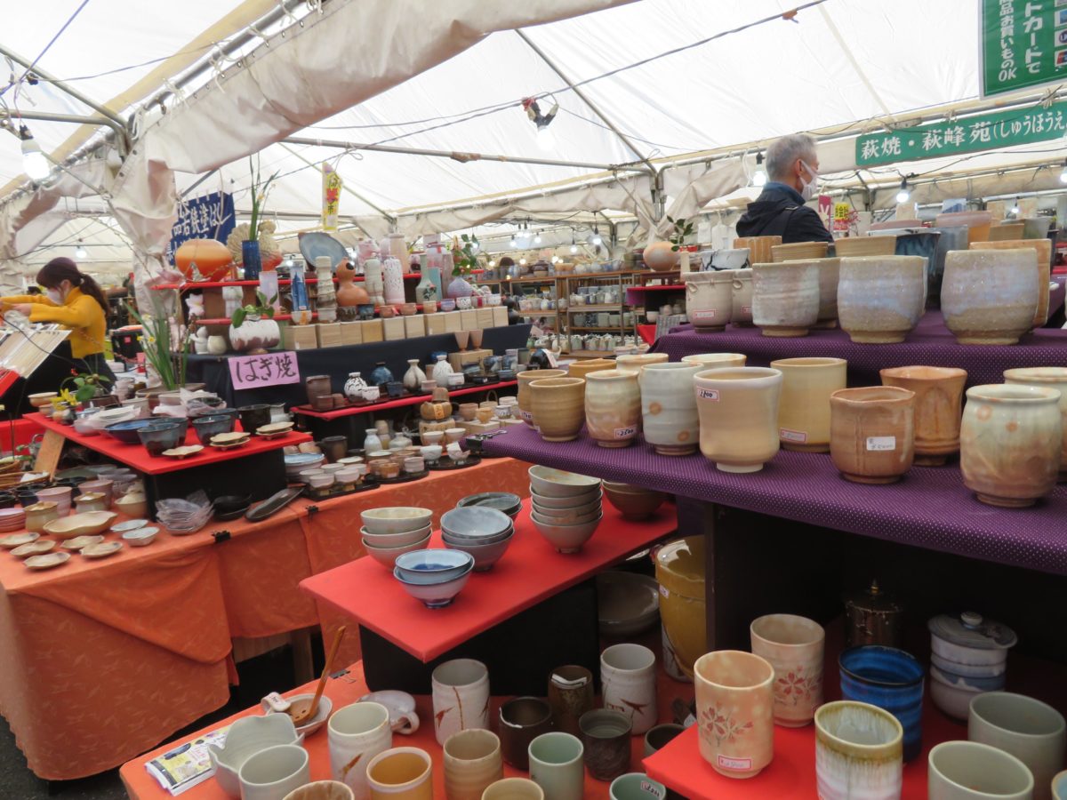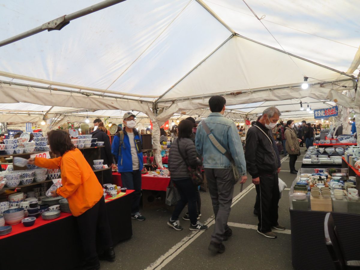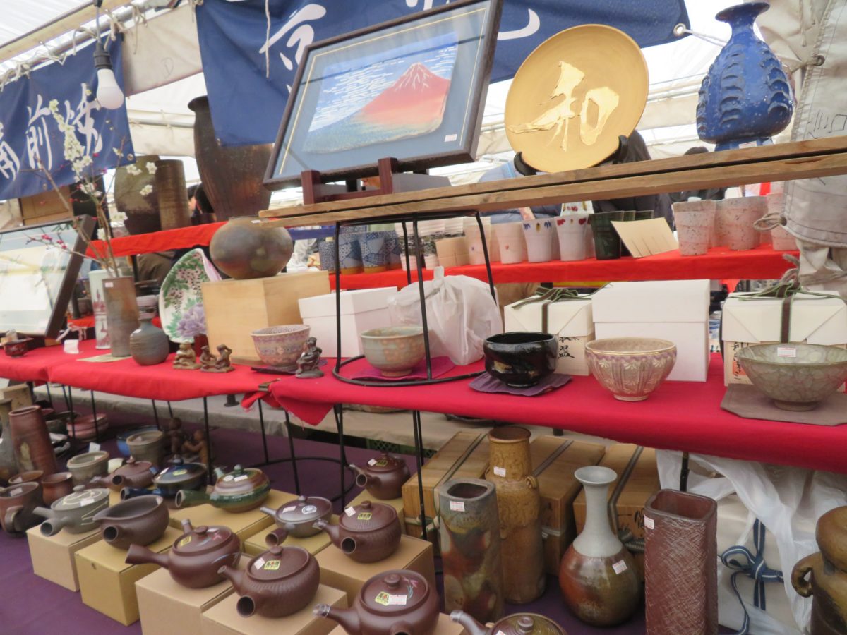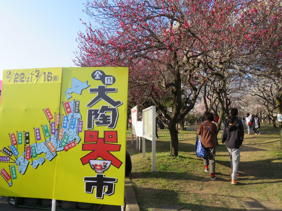 梅林沿いの駐車場では、大陶器市が行われます。伊万里焼、萩焼、備前焼、有田焼など全国有数の陶器が販売される大規模な市です。