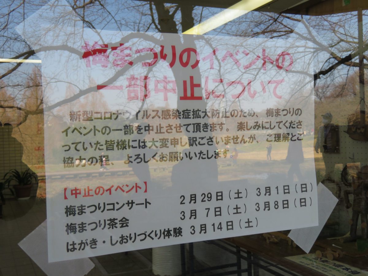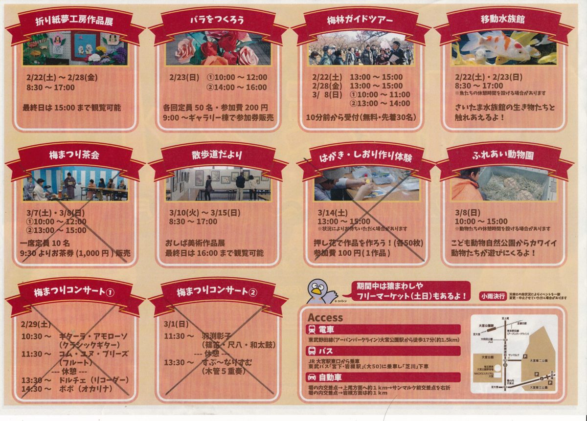 2月24日に配布された「大宮第二公園梅まつり2020」のチラシ裏面のイベント中止案内