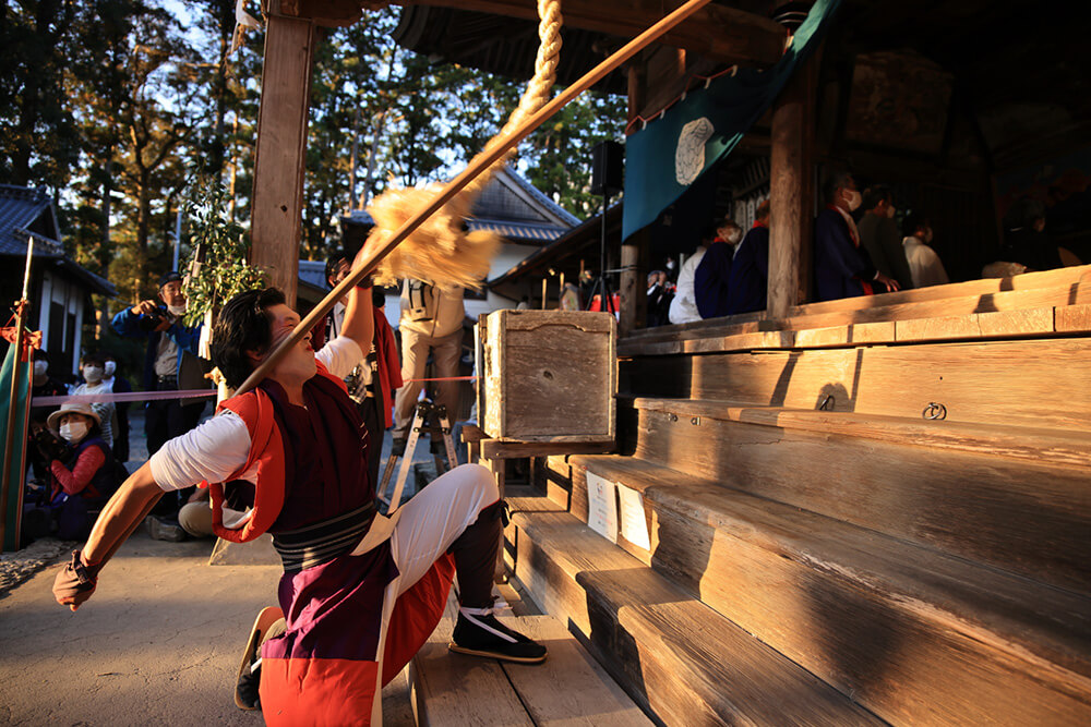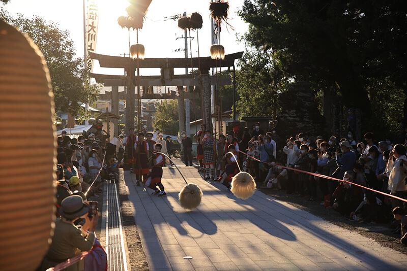 陽が傾きかけた頃に行列が神社に戻ってきました。金色に染まる社殿の前で、クライマックスの「練り込み」が行われます。10人の青年たちが対になって歩み出て、二人が「型」を揃えて「鳥毛・白熊」を倒して見せます。長い棒の先で揺れる「鳥毛・白熊」が逆光の中でシルエットを描く様は息を呑むほど美しいものです。