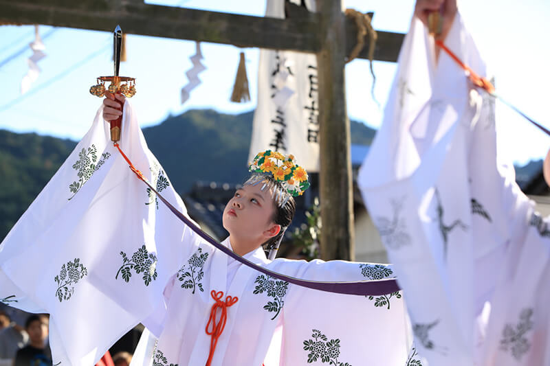 おなばれは「年に一度の神様の遠足」ともいわれ、神様は神輿に乗って御旅所まで、「棒打ち」や「鳥毛」によって清められた道中を進みます。その昔、地域の人々は家の宝物である刀や面、鉾や弓矢などを持ち寄って行列に参加したんだそう(今ではそのほとんどが神社の蔵に保管されています)。