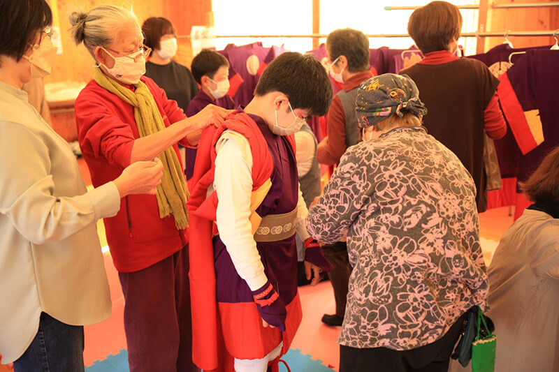 おなばれ保存会のみなさんやサポートする方々は「1 年ぶりでも忘れたりするのに、3年ぶりともなると何をどう身に着けさせたか記憶を辿るのが大変ちや」と、てんてこ舞いながらも気分は高揚して楽しそうです。