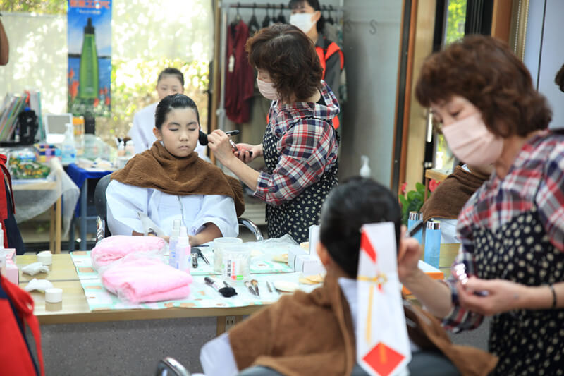 美容室で準備が進む舞姫たちは、大宮小学校5年生の女子4人組。練習は「移動しながら舞うのを覚えるのが大変で、床にテープを貼って練習した」そうです。美容師さんたちは「肌がツルツルで化粧のノリがえいのが羨ましい!」「私らぁが小学生の頃は平日の開催(以前は10月27日に開催されていたが、近年は11月3日に固定)やったき、おなばれに参加する同級生が学校を早退して行くのが羨ましかったねぇ」などと昔話にも花を咲かせながら、舞姫の目元に紅を差していました。