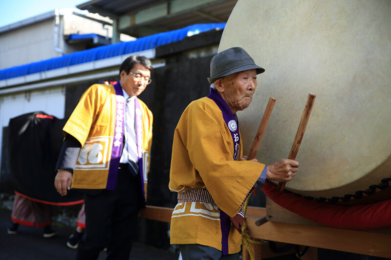 なんと!大太鼓と共に2キロの行程を歩み、一人で叩き続けていたのは90歳を超えてらっしゃるという松本さん(通称:ひろいっちゃん)!物部地域に伝わる民間信仰「いざなぎ流」を元とする独特のリズムでおなばれを見事に囃していらっしゃいました。半世紀にわたってこの役目を担っているそうですが、ひろいっちゃんの跡を継げる人が育っていないことが悩ましいところ。