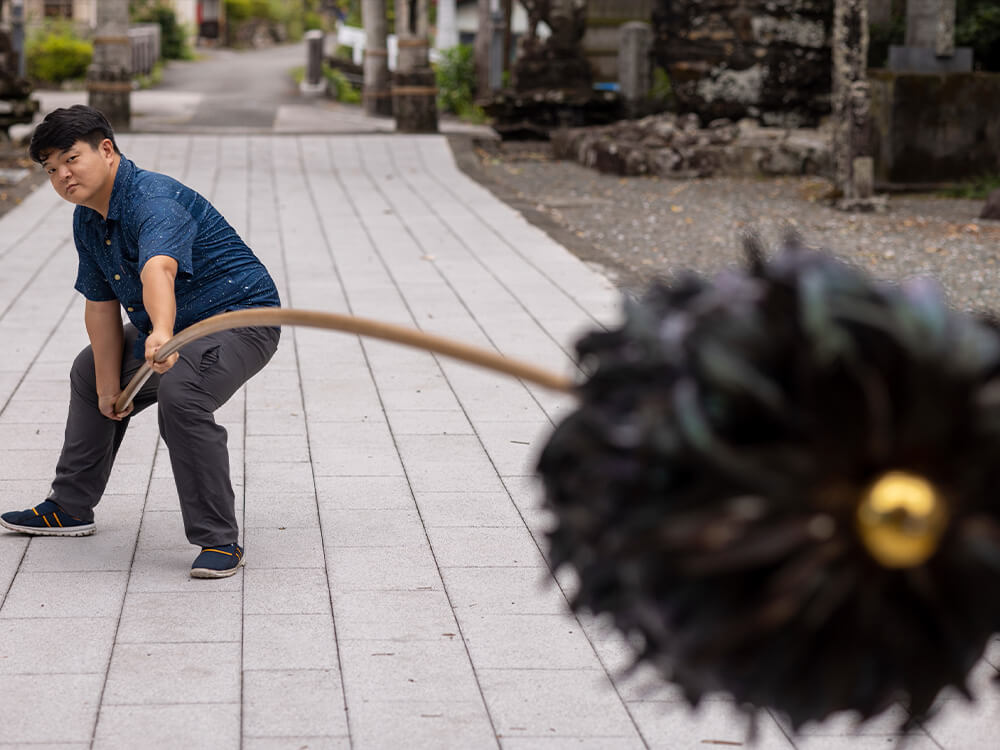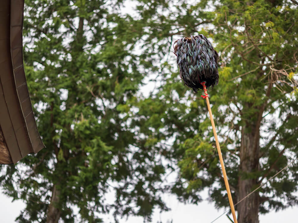 鳥毛の棒は3つの地区(谷相:たにあい、朴ノ木:ほおのき、美良布:びらふ)ごとに長さや重さが異なる10本があり、それぞれ対になっています。一番軽いのは朴ノ木地区の鳥毛。練習中に「おまん、その鳥毛を落としたら朴ノ木の人に怒られるぞ!」とヤジが飛んだりもします。美良布地区が持つ鳥毛は一番重く“ヒバリ”という呼び名がついていて、これを振るのが「花形」です。誰がどの鳥毛を振るのか決まるのは各自の仕上がり次第、本番直前ギリギリになります。