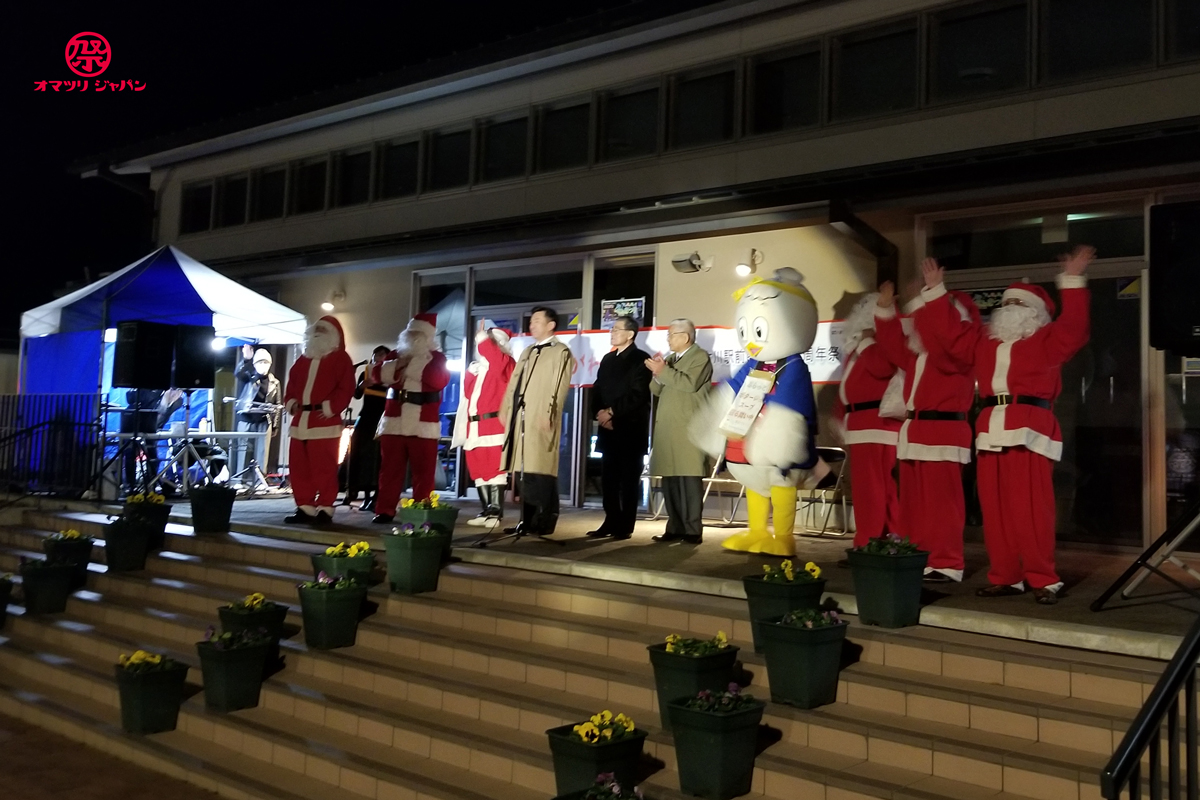 昨年はクリスマスイヴが休日にあたっていた為、イベントのフィナーレとしてクリスマス花火が打ち上がりましたが、今年は日程の関係で花火だけを24日に移動した様です。また、挨拶の中で来年7月23日に2010年以降休止となっていた女川みなと祭り・海上花火大会が復活するとの発表がありました。