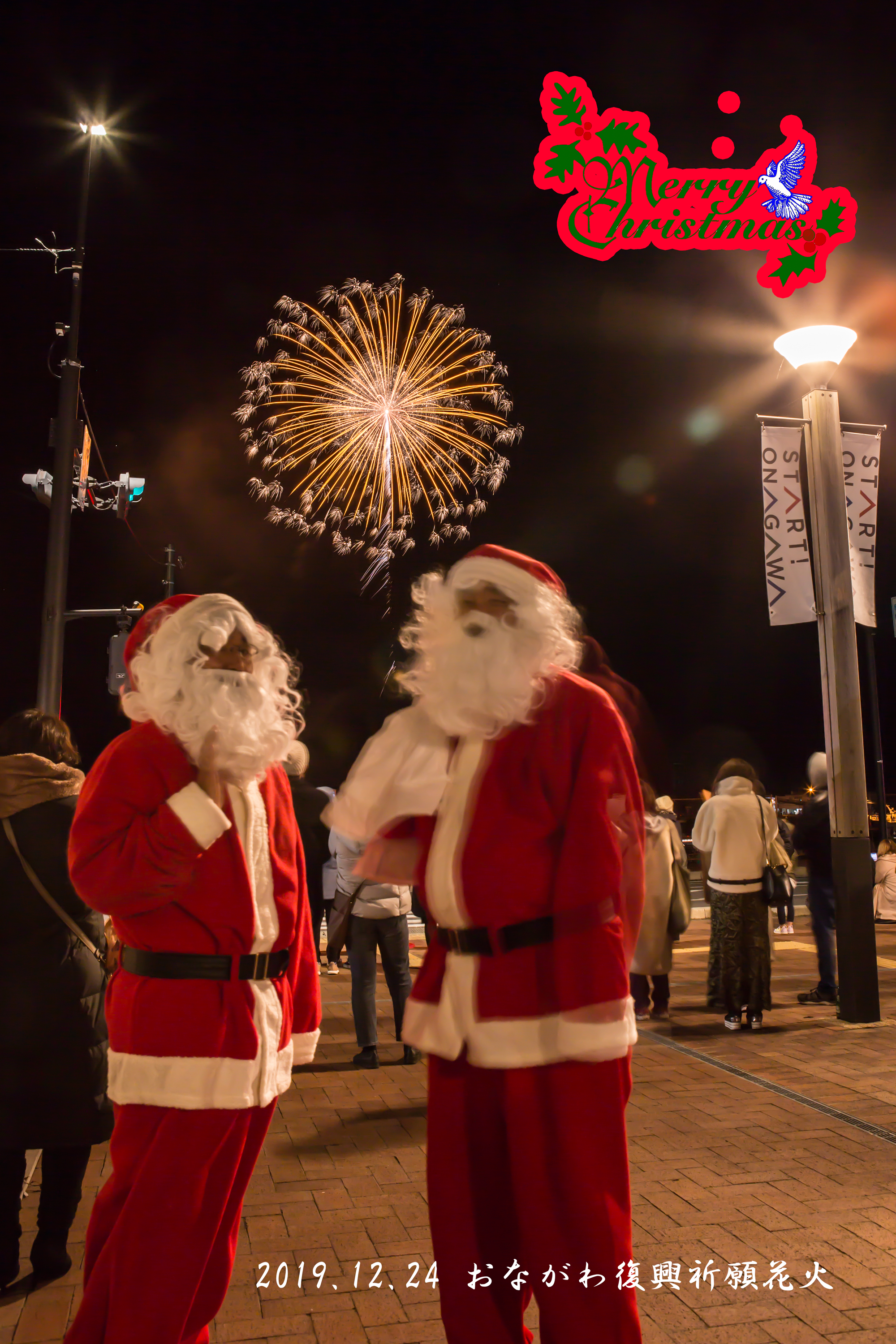 なお、打ち上げ中にはサンタクロースが会場に来ている子供達にクリスマスプレゼントを配って歩く姿もみられました。折角なので花火と一緒に写って貰いました。また花火師さんによると現在でも尺玉を打ち上げる保安距離はある様なので、来年のみなと祭りでは是非とも尺玉の打ち上げを行って頂きたいものです。