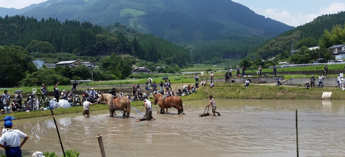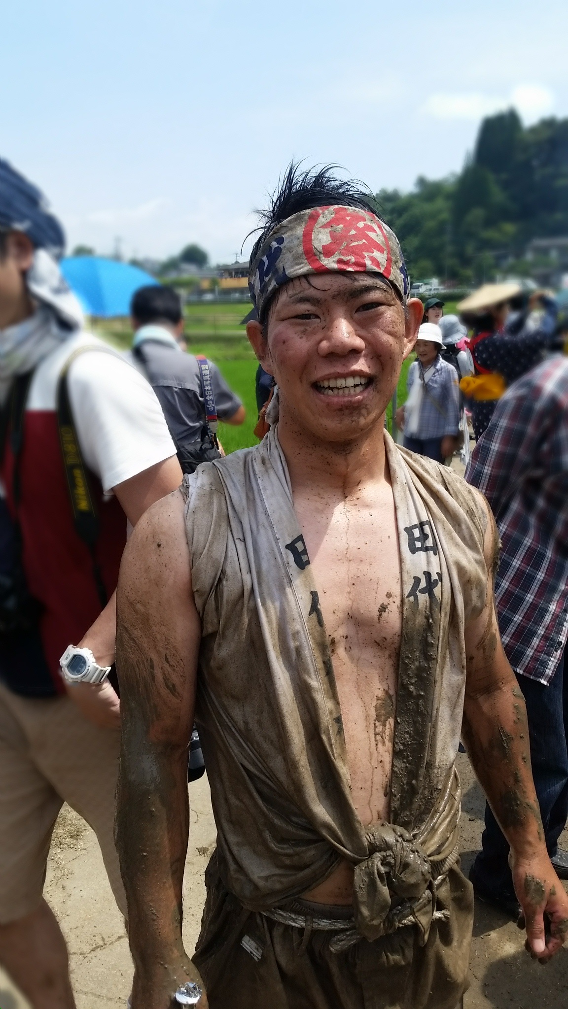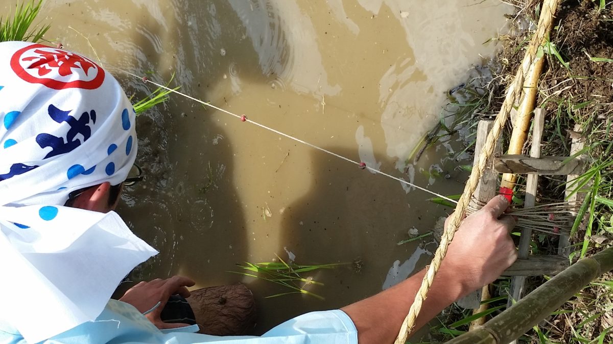 水はゆっくりと溜め、土にじっくり吸わせます。そして、代掻きをするのですが、その前に暴れまくるぞーというのが、西郷の御田祭。水が溜まっていたら、そこではしゃいでみたくなるのは、当たり前!